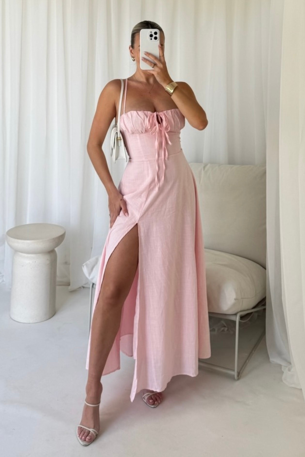 Introducing the Linda linen look maxi dress - perfect for summer! With its playful split leg design and tie-up back detailing, this dress is both flirty and functional. Say "hello" to a new level of style and comfort!