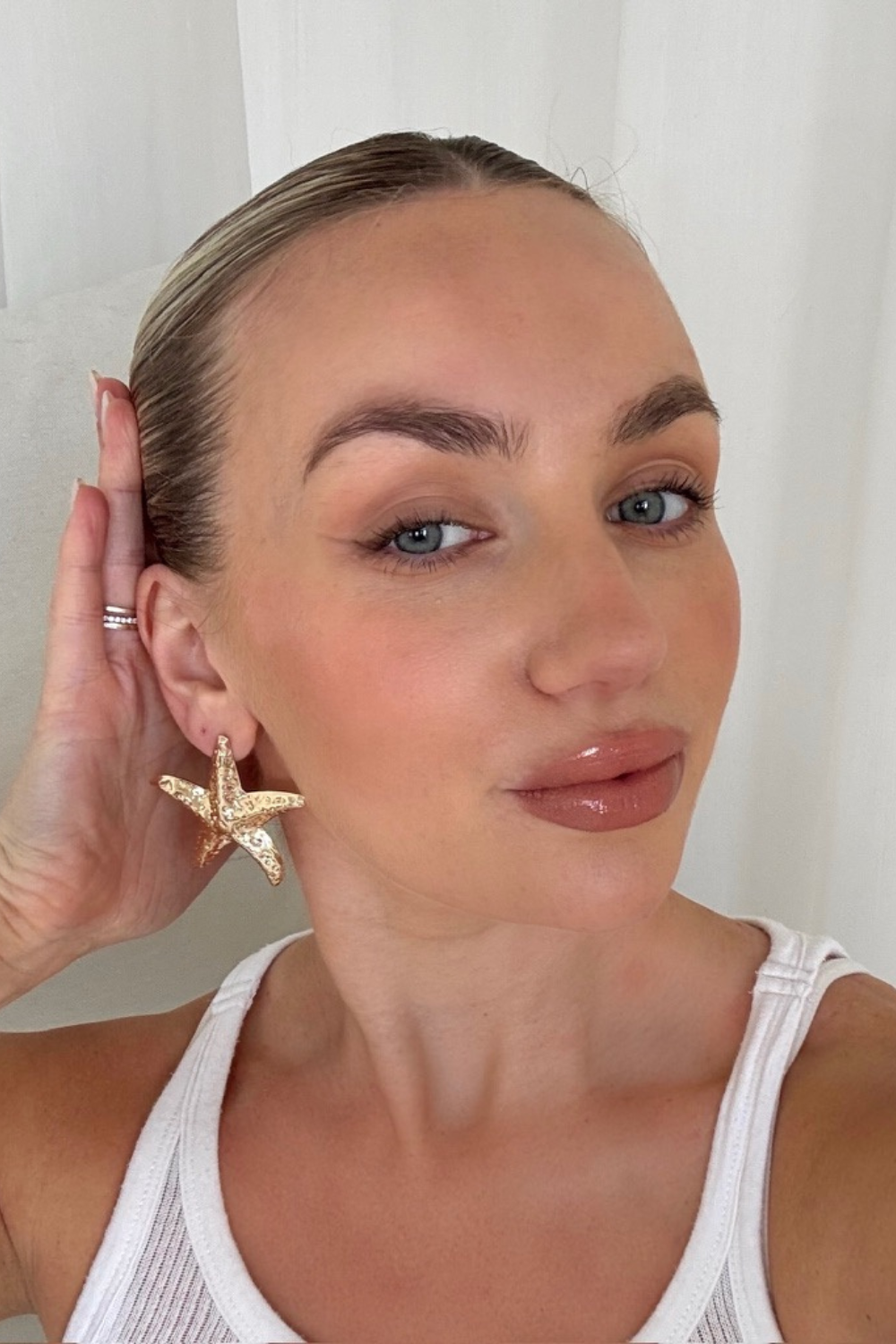Complete your look with Freya's gold starfish earrings and necklace. Perfect for any outing on the beach, these pieces add a touch of whimsy with their playful starfish design. Make a statement with this unique set that's sure to catch everyone's eye.