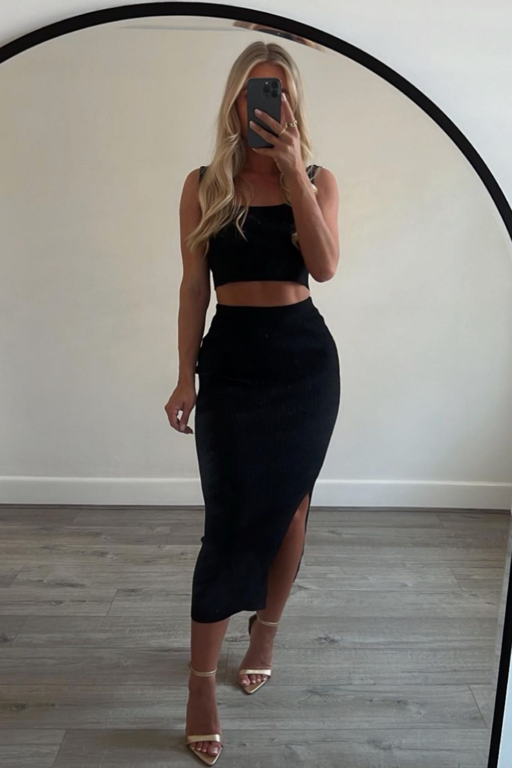 Introducing our newest two-piece 'Vivian' this is made from the most stunning ribbed material, the set consists of a black crop top with thick straps and a matching ribbed mid-length skirt that has an amazing split leg. style with heels and a nice bag for a full glam look.