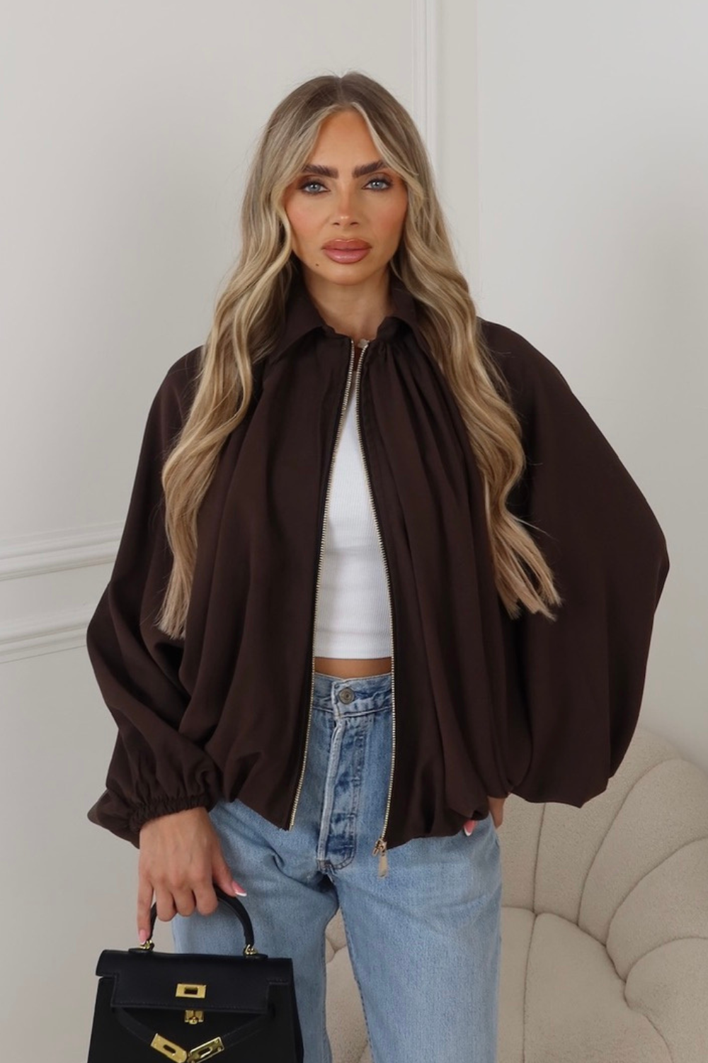 The Amelia drape is a stylish outerwear piece that combines the classic bomber silhouette with a relaxed, flowing fit.The design offers a modern, effortlessly cool look perfect for layering.