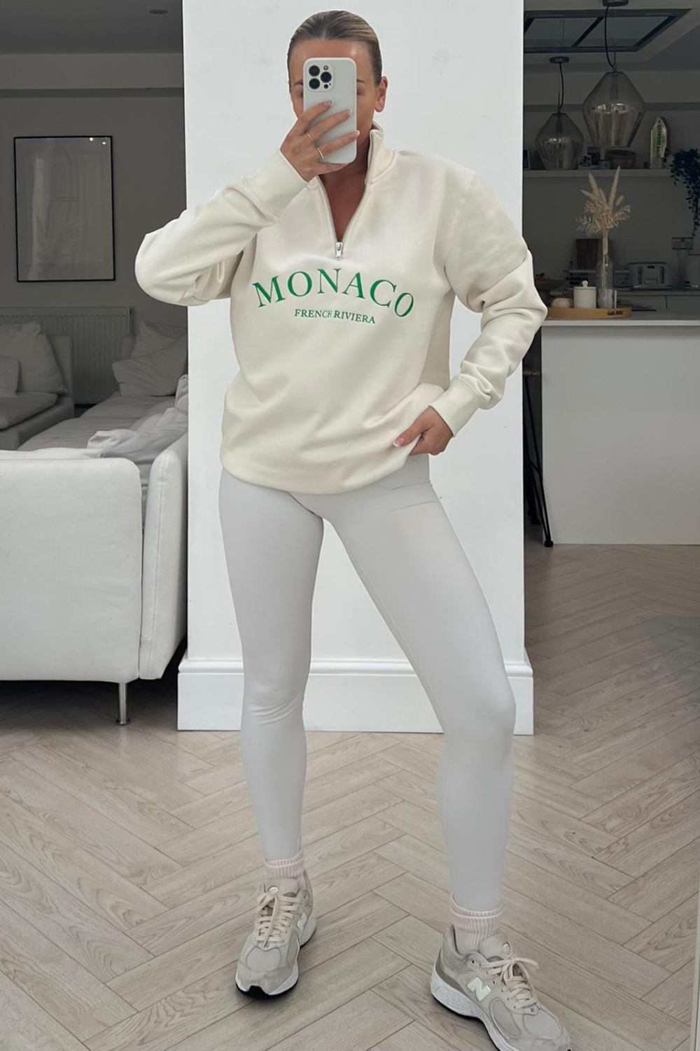 We all need a go to sweater and our newest arrival is exactly that !, our ' monaco ' sweater is made from a soft fleece line ecru material and has long sleeves and a 1.4 zip neck line . Style this with leggings or cycling shorts and fresh trainers for a complete look.