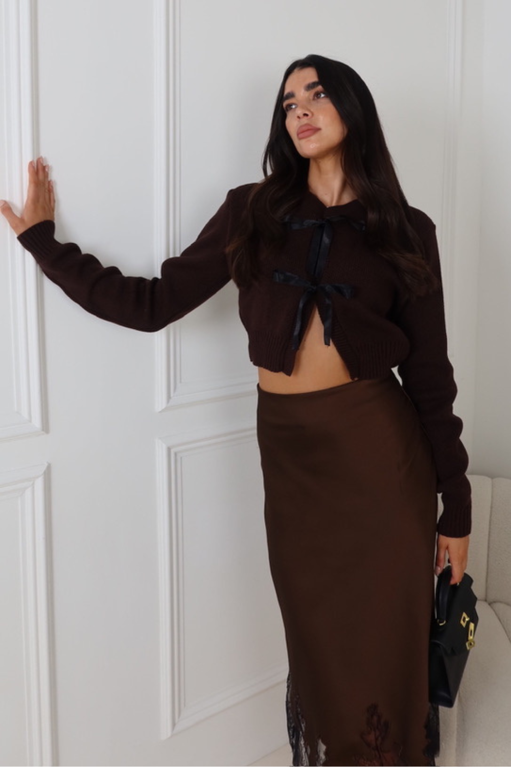 MILDA CHOCOLATE KNITTED SILK FASTENED CARDIGAN