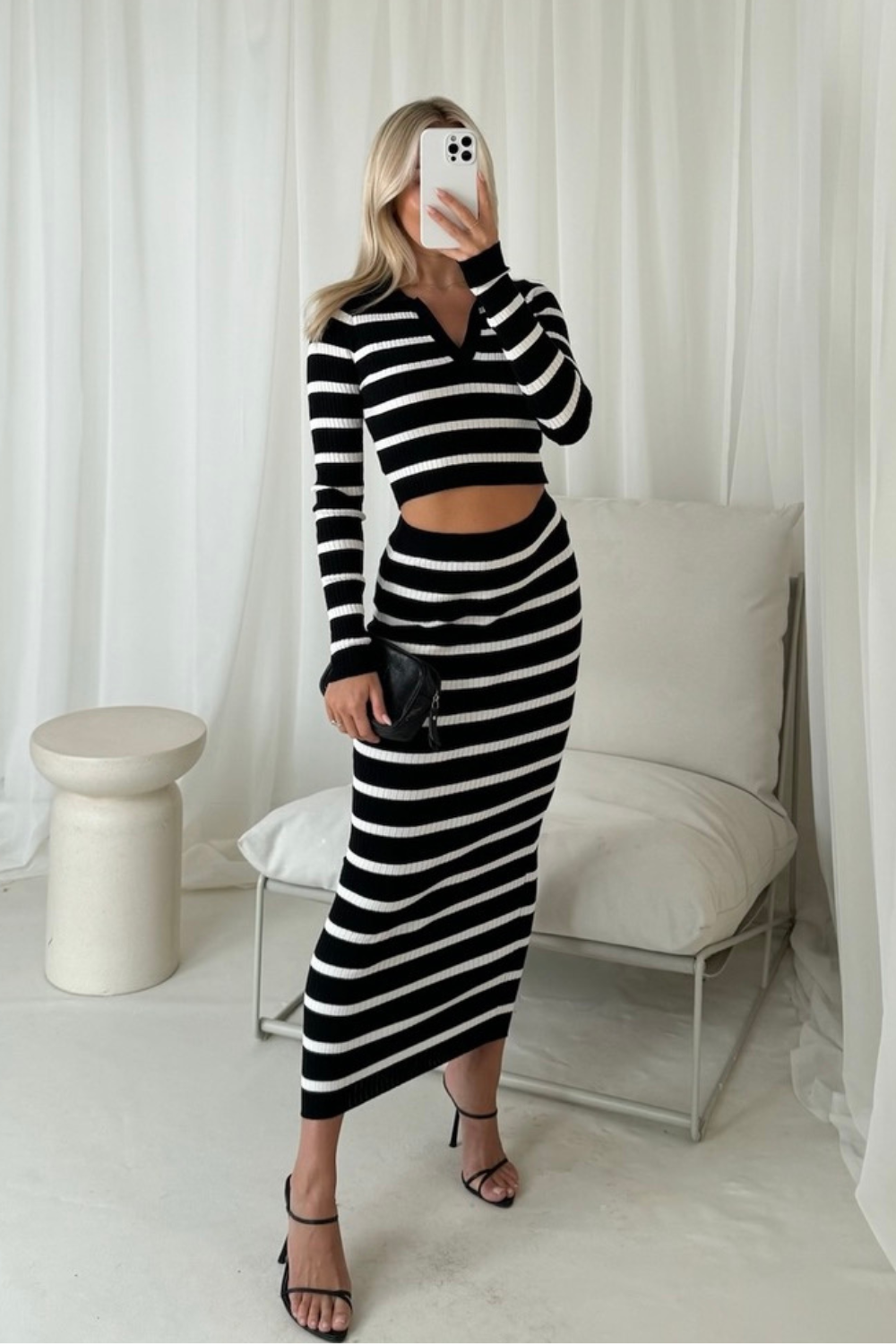 Conquer the fashion game with our Darla black striped midi skirt co-ord. This ribbed fabric set will hug your figure in all the right places, while the bold black and white stripes add a touch of daring to your look. Get ready to turn heads and make a statement with this tight fitting, figure hugging co-ord.