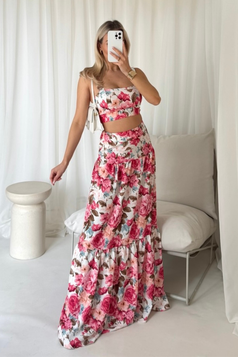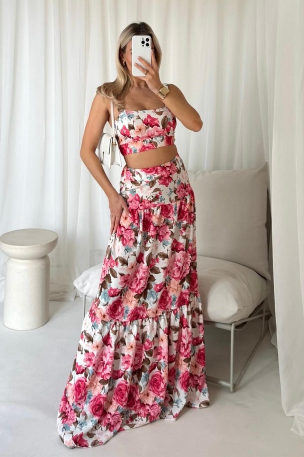 Get ready to turn heads in our Gabbi floral co-ord set. The chic floral print on this crop top and maxi skirt combo is perfect for your next holiday. Classy yet playful, this co-ord will elevate your style game effortlessly!