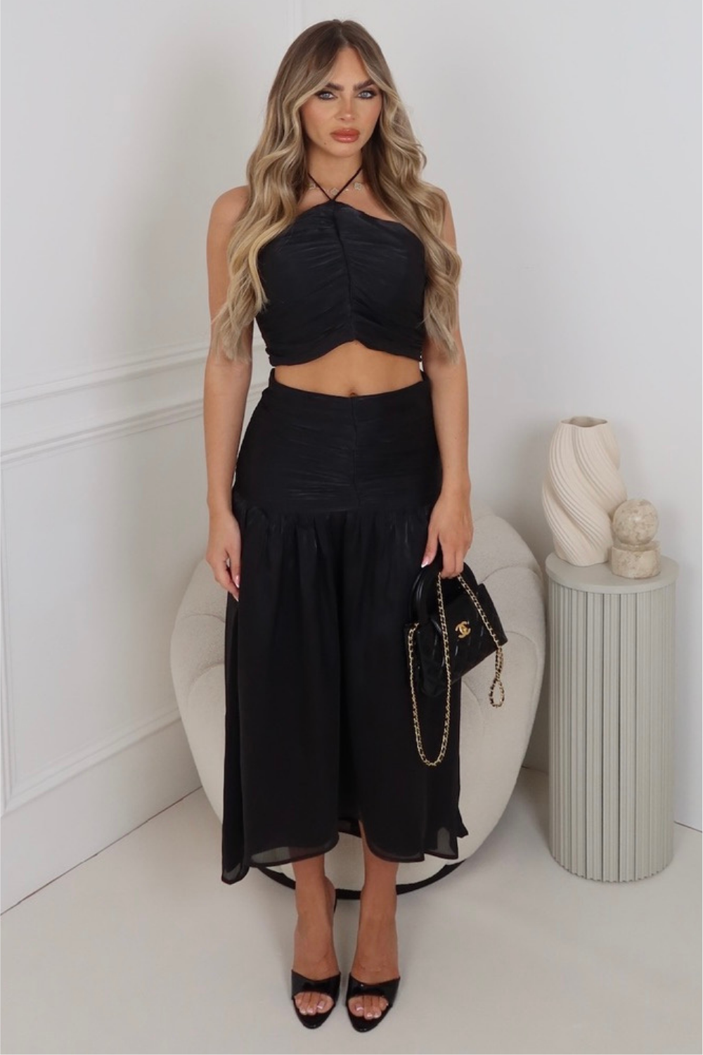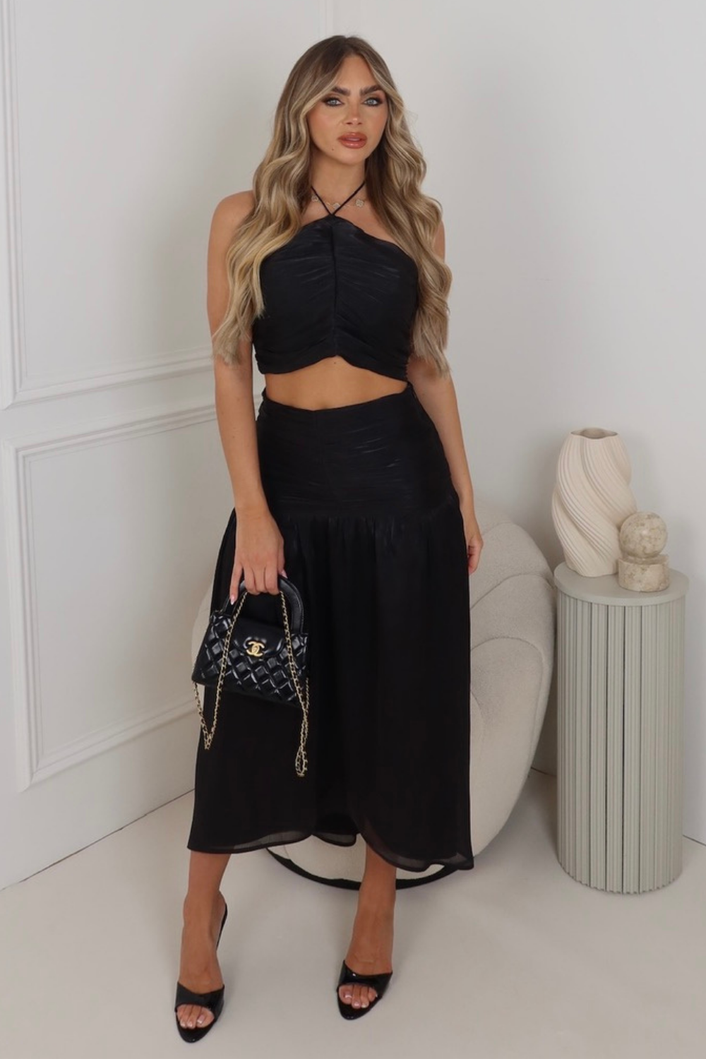 Coordinate your style game with the Mila halterneck crop & midi skirt co ord. The shirred stretch back and zip closure offer a comfortable and flattering fit, while the versatile design allows for dressing up or down for any summer occasion or holiday.