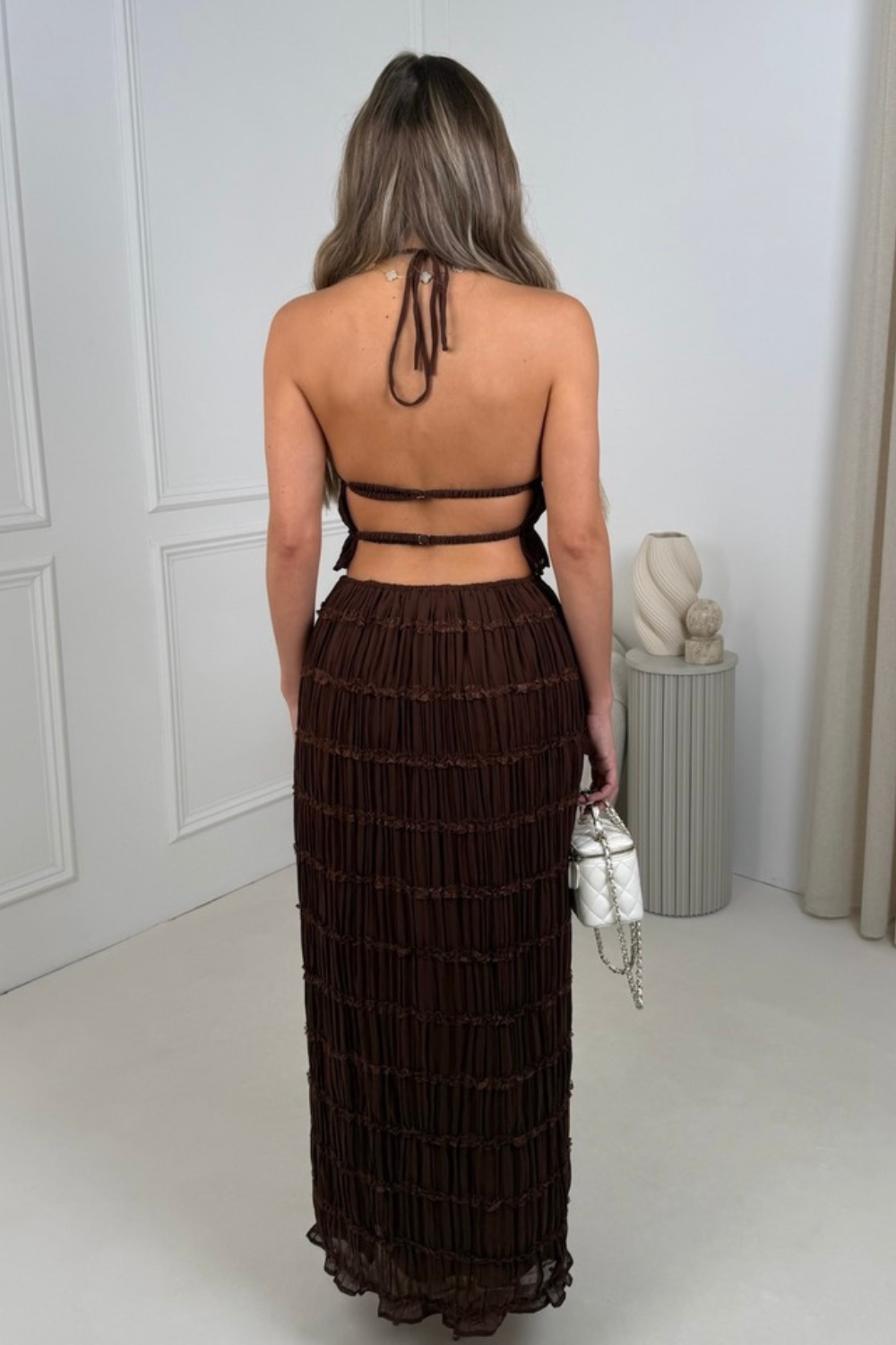 Unleash your inner free spirit with our Ophelia co ord set. The flowy chiffon maxi skirt is paired with an open back halter top, featuring a tie neck and back. Perfect for a boho-chic look, this set will have you feeling effortlessly stylish.