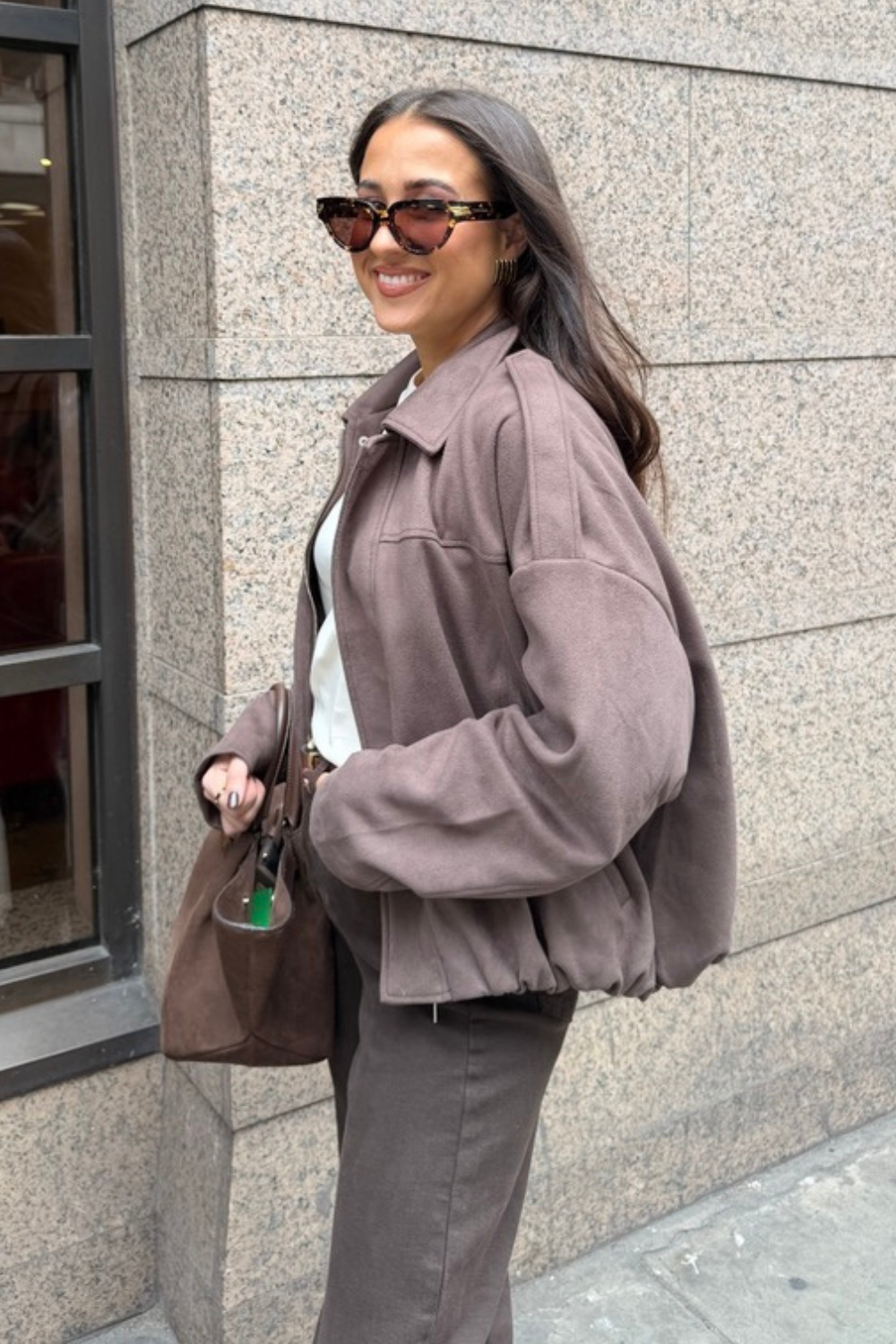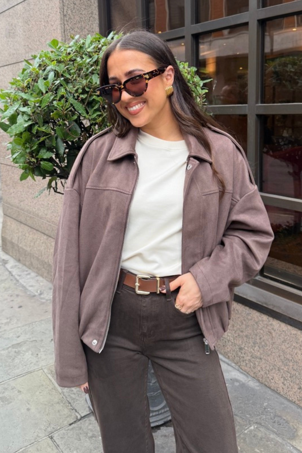 Make a statement with this faux suede jacket, designed in a soft, minimalist silhouette. Clean lines and subtle details make it a versatile staple for a refined, everyday look. Perfect for layering over neutrals or elevated basics, it brings a polished, understated touch to your wardrobe ideal for achieving that cool girl aesthetic.
