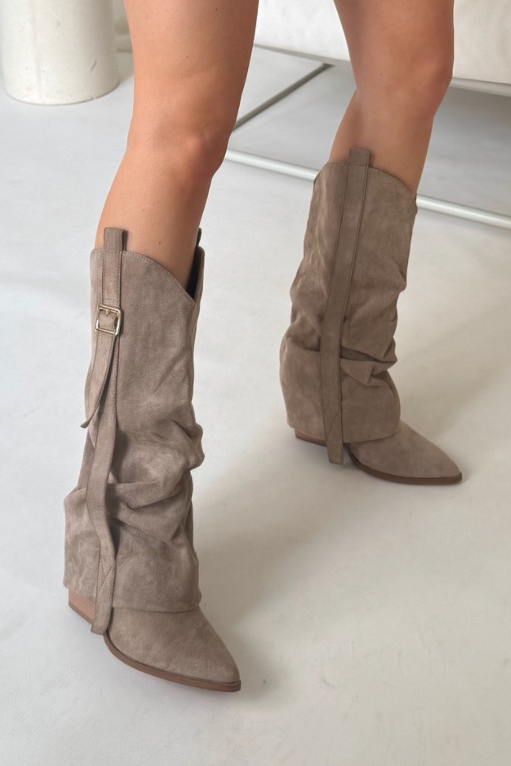 Show off your wild side with the Joely khaki ruched heeled cowboy boots. With a playful ruched style and side buckle, these boots are perfect for dressing up or down at festivals, summer nights or any occasion.