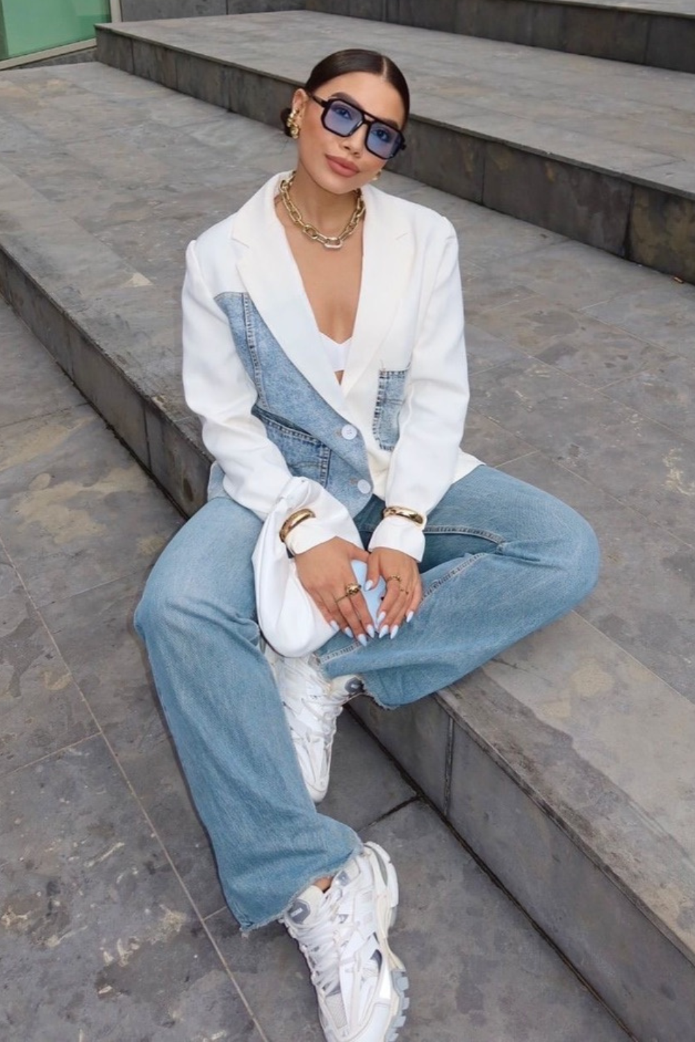 Elevate your style with the Kady blazer in white and blue denim. With flattering shoulder pads, this blazer is perfect for dressing up or down. Embrace your inner cool girl with this must-have addition to your wardrobe!