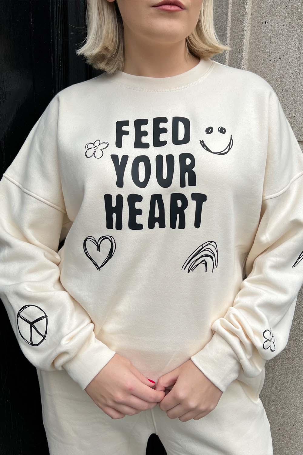 Introducing our new sweater set ' feed your heart' , the set consists of a stunning ecru sweater that has our in house ' visionary ' ; design printed on the chest. This also comes with a matching pair of drawstring joggers that are also printed. Style with fresh trainers for a complete look.