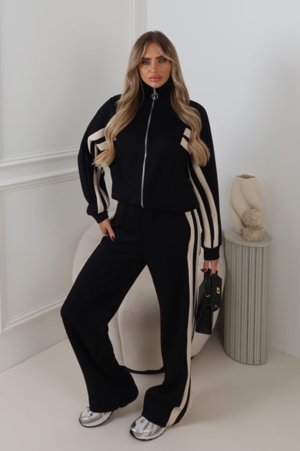 This loungewear set features a tracksuit design with chest to sleeve double piping and an elasticated waist for ultimate comfort. The zip-through jacket adds a touch of style, while the wide leg trousers provide a chic and relaxed look. Perfect for comfortable and fashionable lounging.