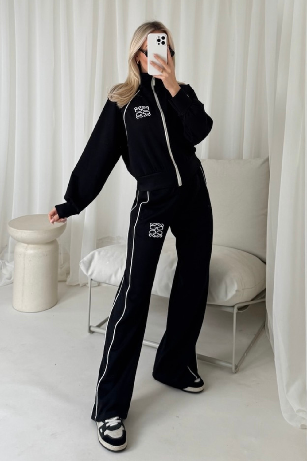 Unwind in style and comfort with our Gege embroidered loungewear set. The cozy zip through jacket and wide leg trousers come equipped with an elasticated waistband and stylish contrast piping, perfect for relaxing at home or running errands. Lounging never looked so chic!