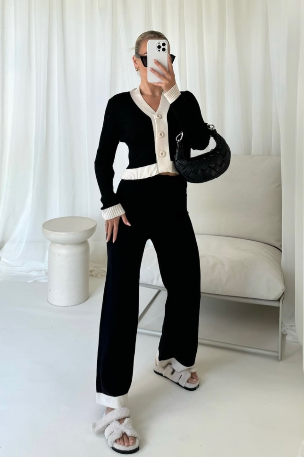 Unleash your playful side with the Josie Black Knit Ribbed Co-ord. This aw wardrobe staple features a cozy knit material, perfect for lounging. The long-sleeved top and wide-leg pants add a touch of sophistication, while the button up design adds a fun and quirky twist. A must-have for any fashion-forward individual!