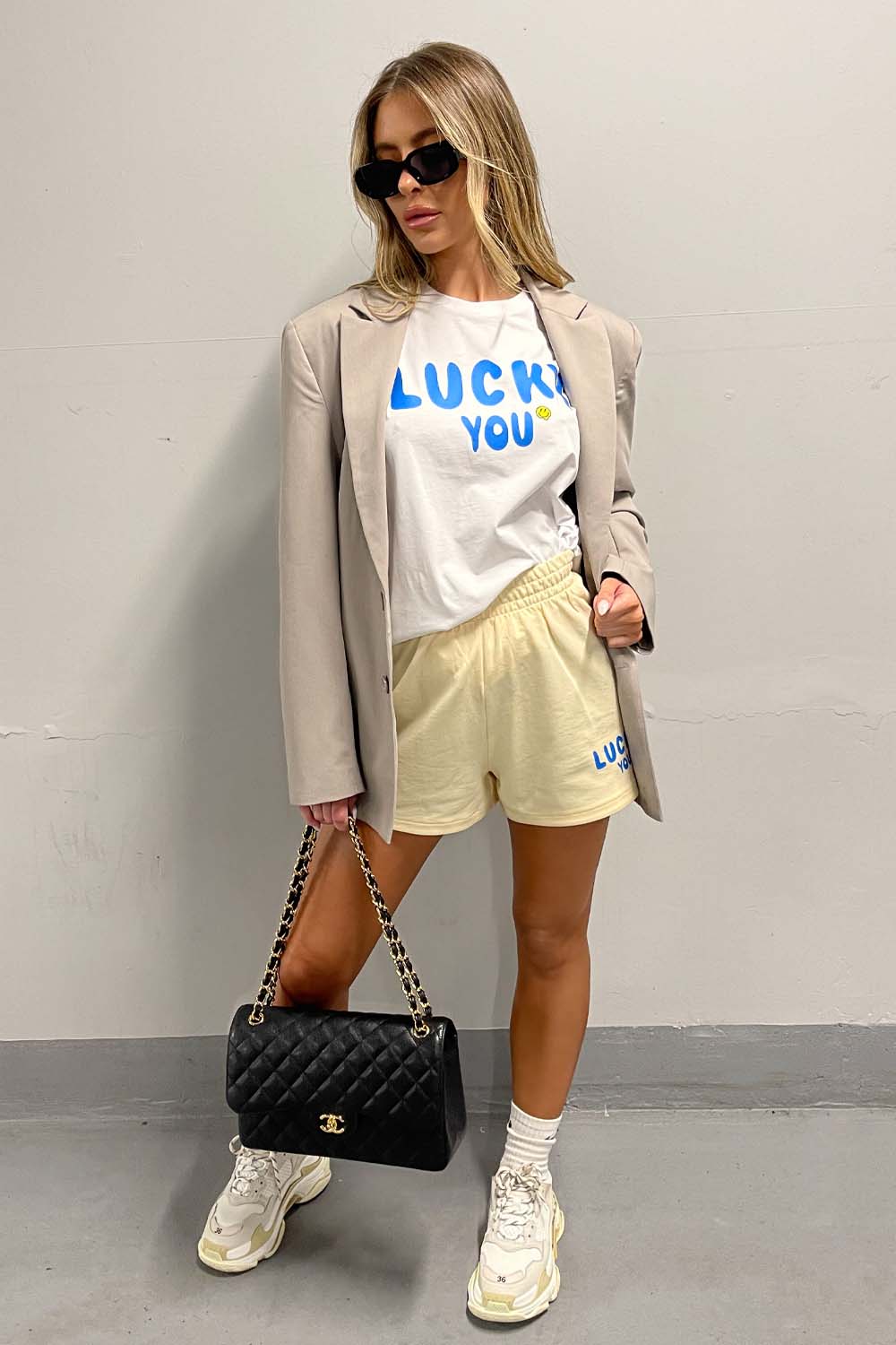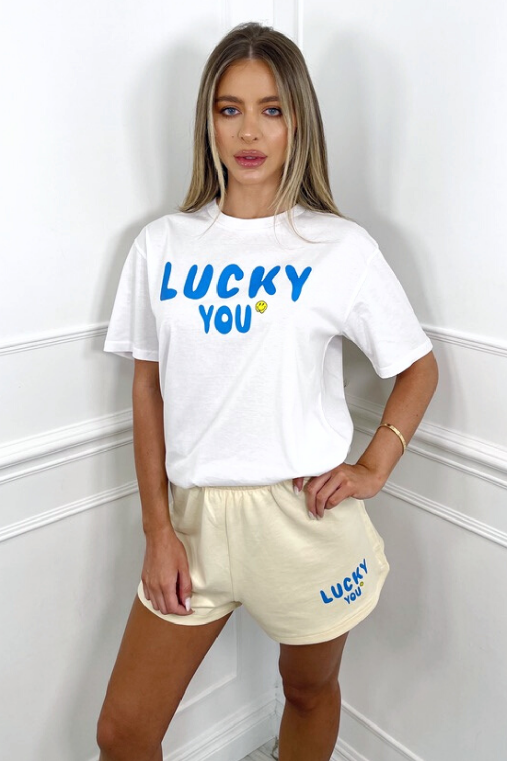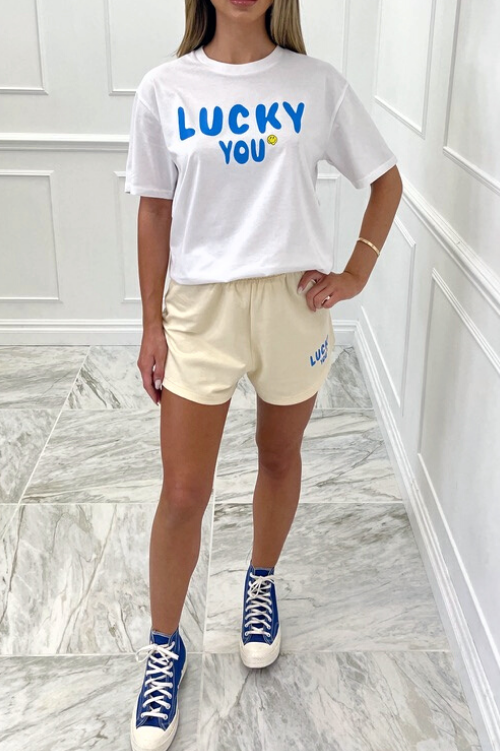 Introducing our newest short Co-Ord ' Los angeles ', the set consists of a brilliant white t-shirt printed with our in-house lucky you design on the chest and a pair of cream shorts with a matching printed design