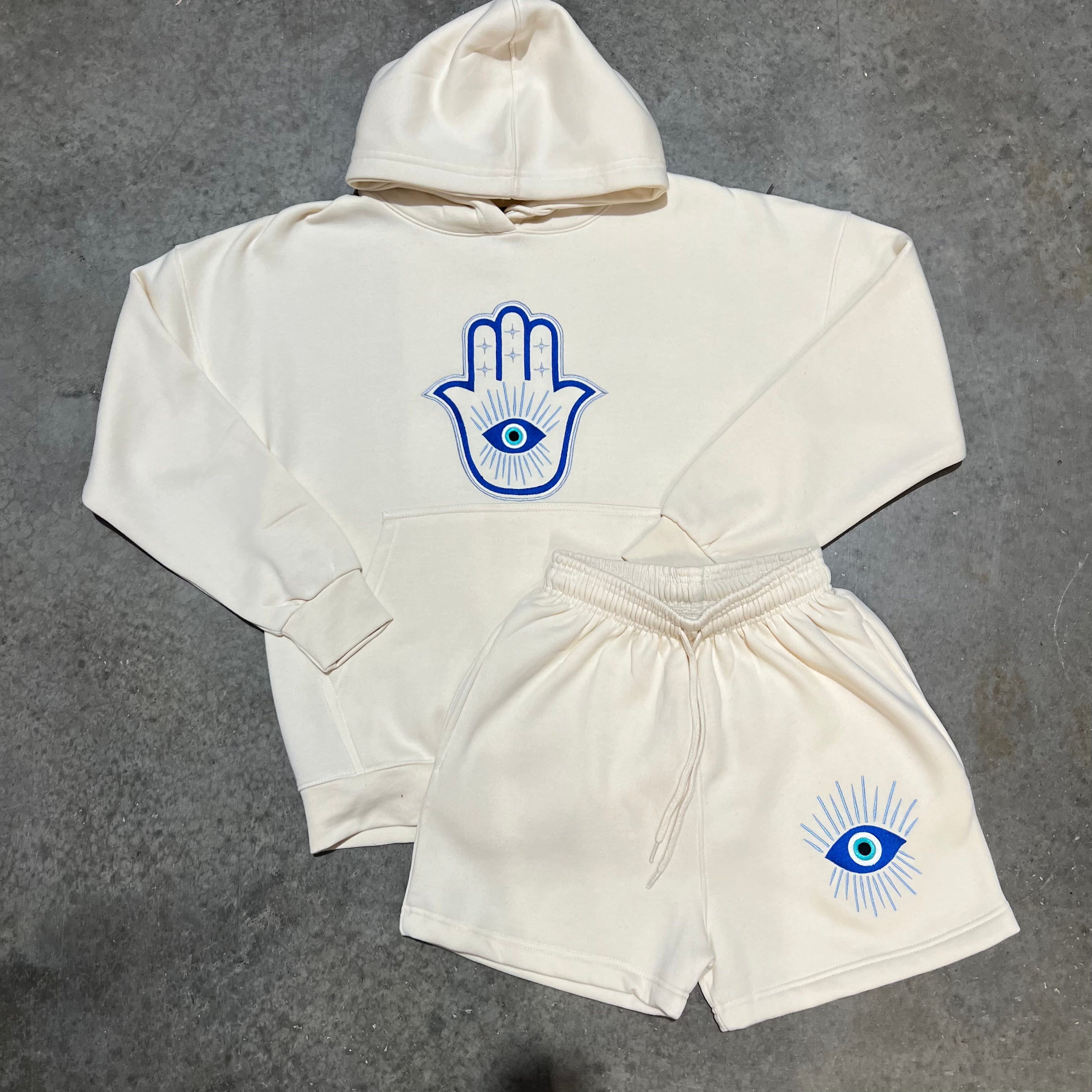 Featuring a soft touch ecru material hoodie, matching elasticated drawstring shorts, embroidered with our stunninghamsab Hand design both the hoodie and shorts are made from the same stunning material, pair this with a pair of fresh chunky trainers for a complete look for your little one, this set is also available in mummy and me.