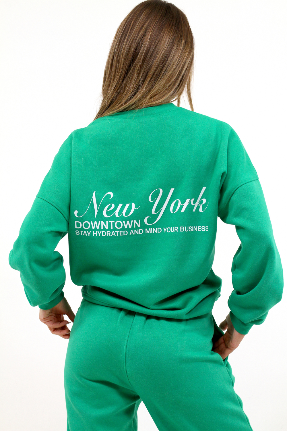 Featuring a soft-touch green material sweater with our printed New York design across the back and a cute New York embroidery detail on the front  , matching elasticated drawstring joggers that are also printed with the same design, both the sweater and joggers are made from the same stunning material, pair this with a pair of fresh chunky trainers for a complete look.