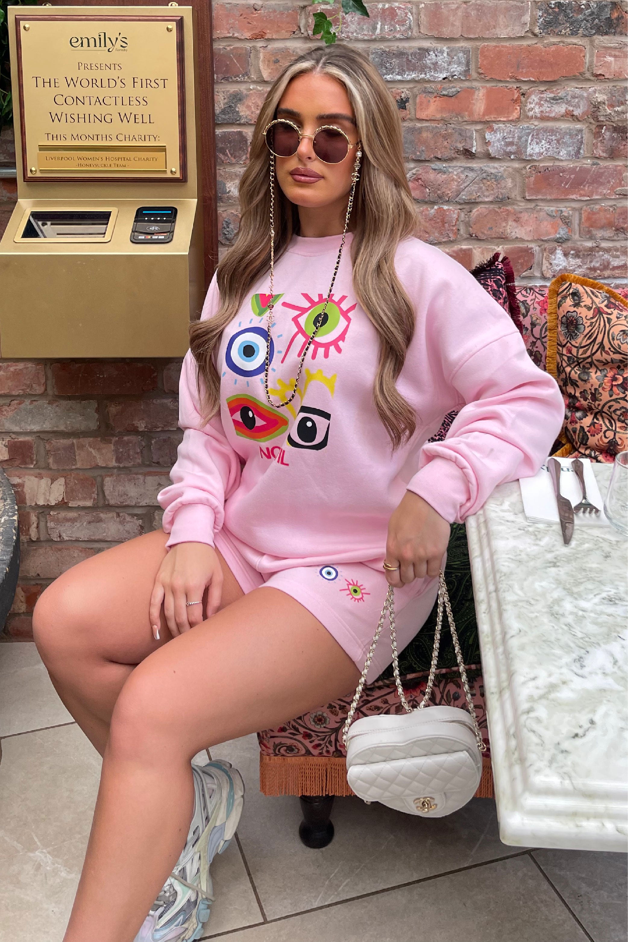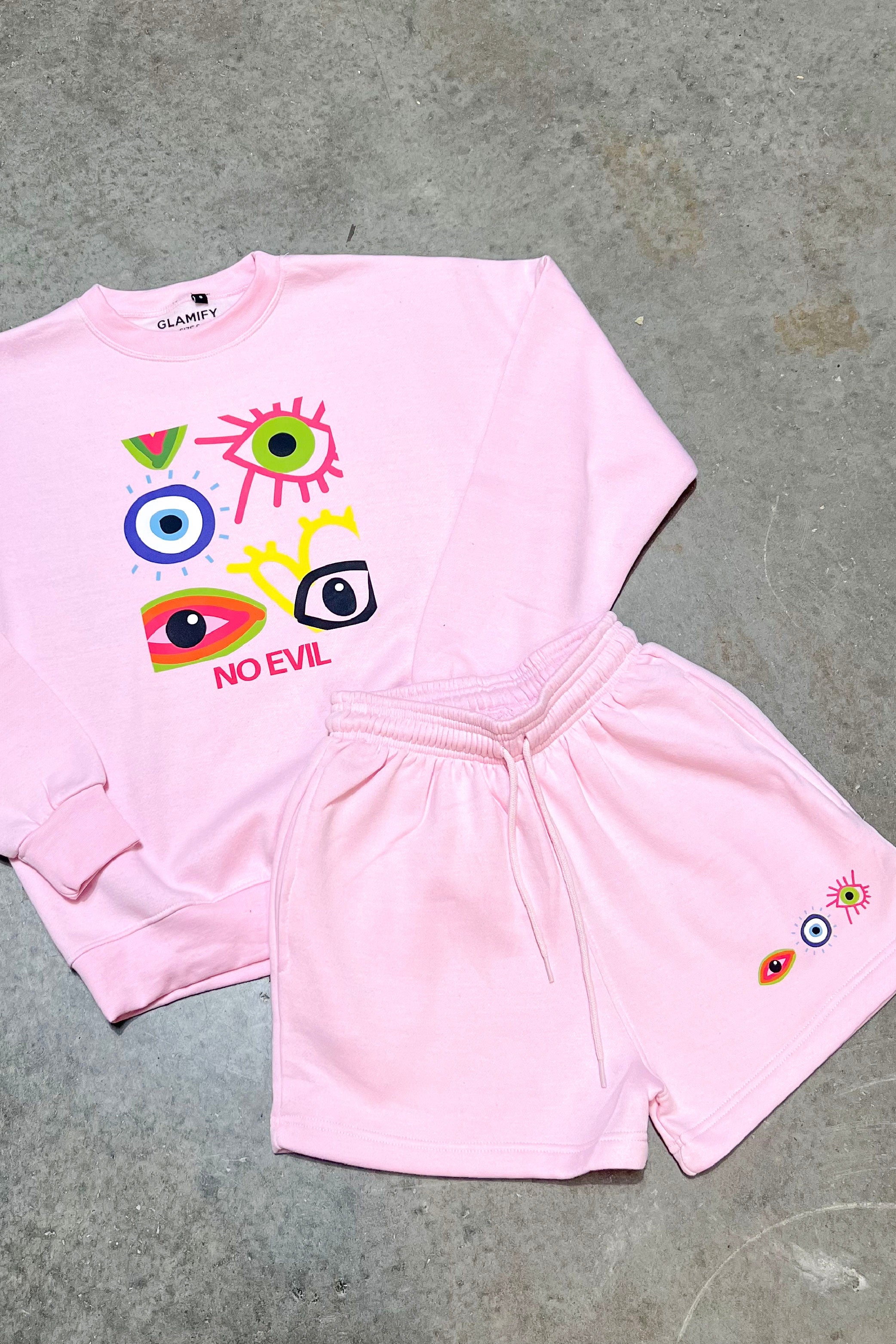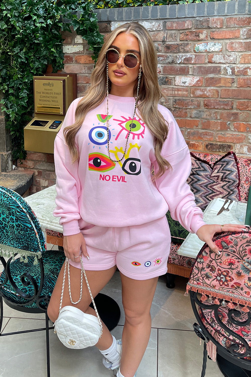 Featuring a soft-touch blue material sweater with our in house no evil Protected, matching elasticated drawstring shorts that are also printed, both the sweater and shorts are made from the same material, pair this with a pair of fresh chunky trainers for a complete look.