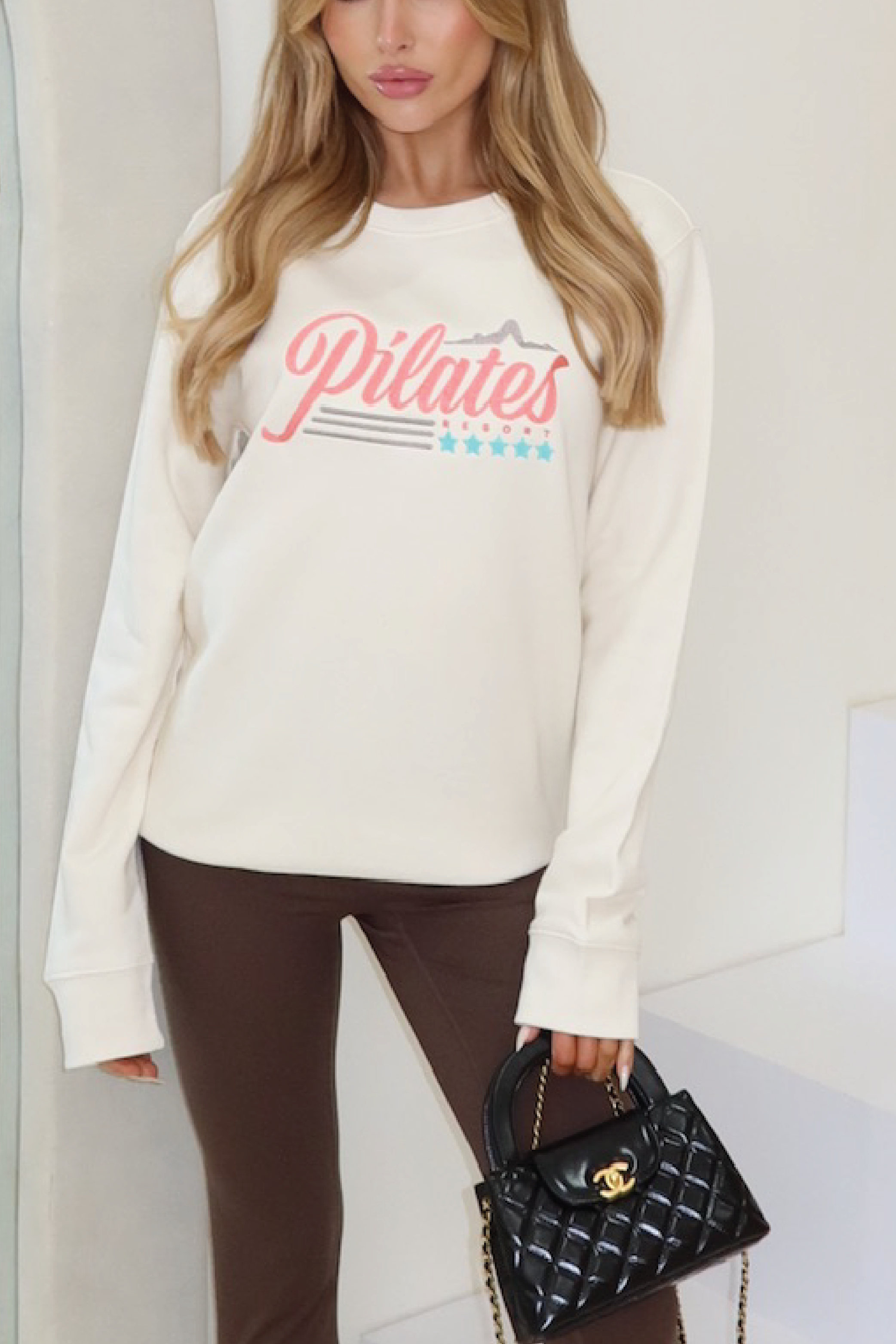Get ready to flow through your Pilates routine in style with our ecru embroidered sweater and legging set. The buttery soft leggings will keep you comfortable while the playful pilates design adds a touch of fun to your workout. Say goodbye to boring activewear and hello to this quirky, yet functional set!
