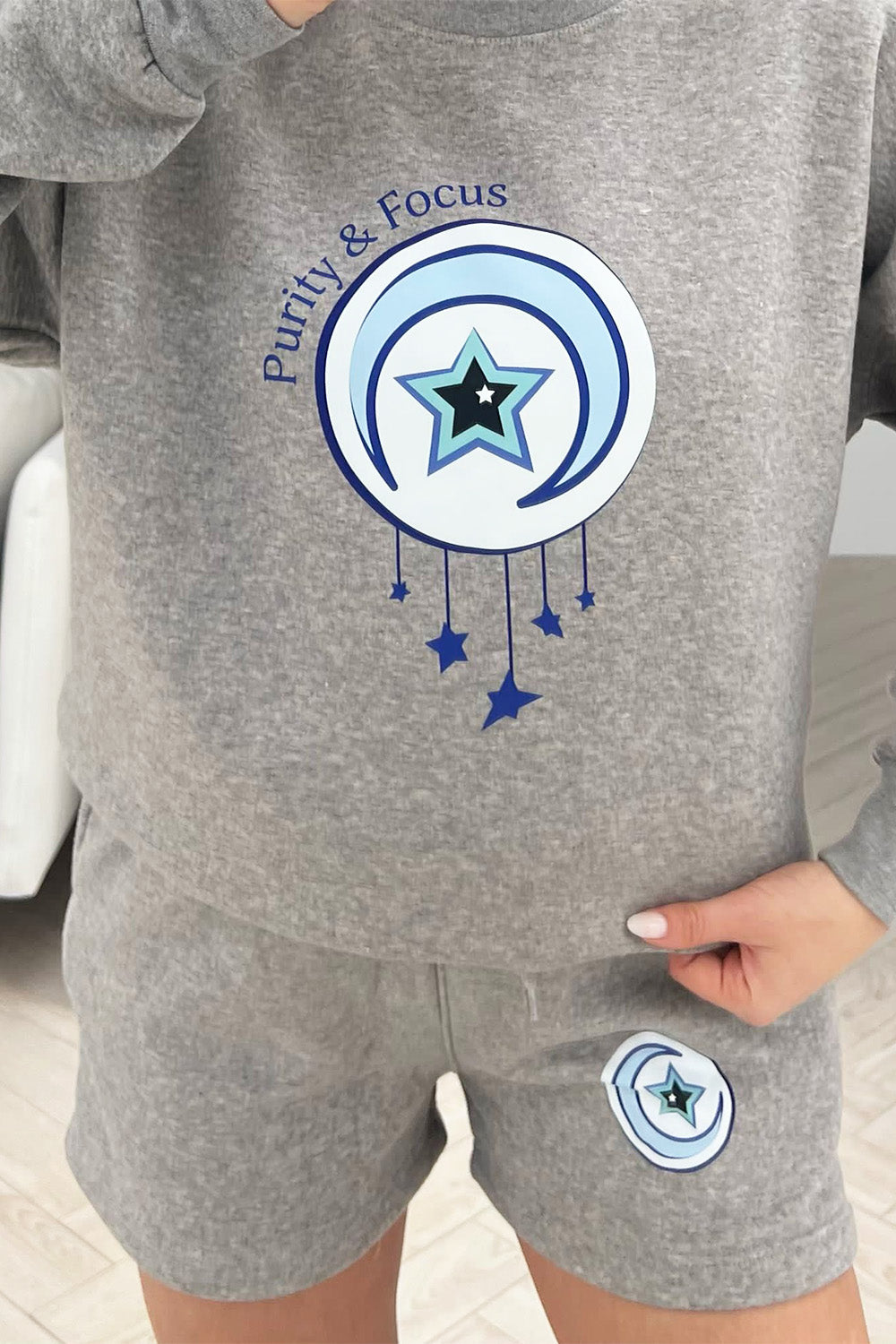 Featuring a soft-touch grey material sweater with our in house print Purity & focus, matching elasticated drawstring shorts that are also printed, both the sweater and shorts are made from the same material, pair this with a pair of fresh chunky trainers for a complete look.