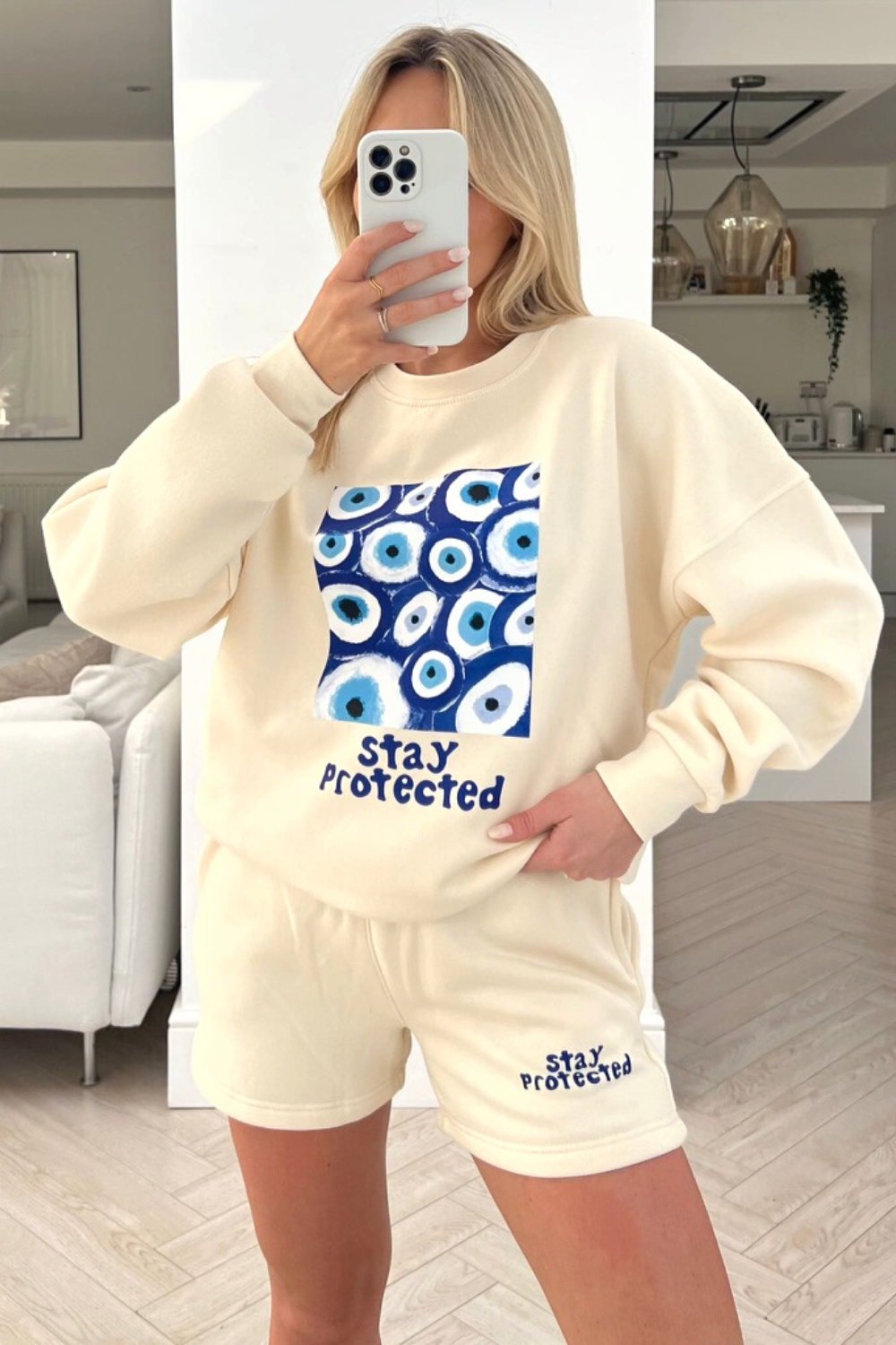 Featuring a soft-touch ecru material sweater with our in house print Stay Protected, matching elasticated drawstring shorts that are also printed, both the sweater and shorts are made from the same material, pair this with a pair of fresh chunky trainers for a complete look.