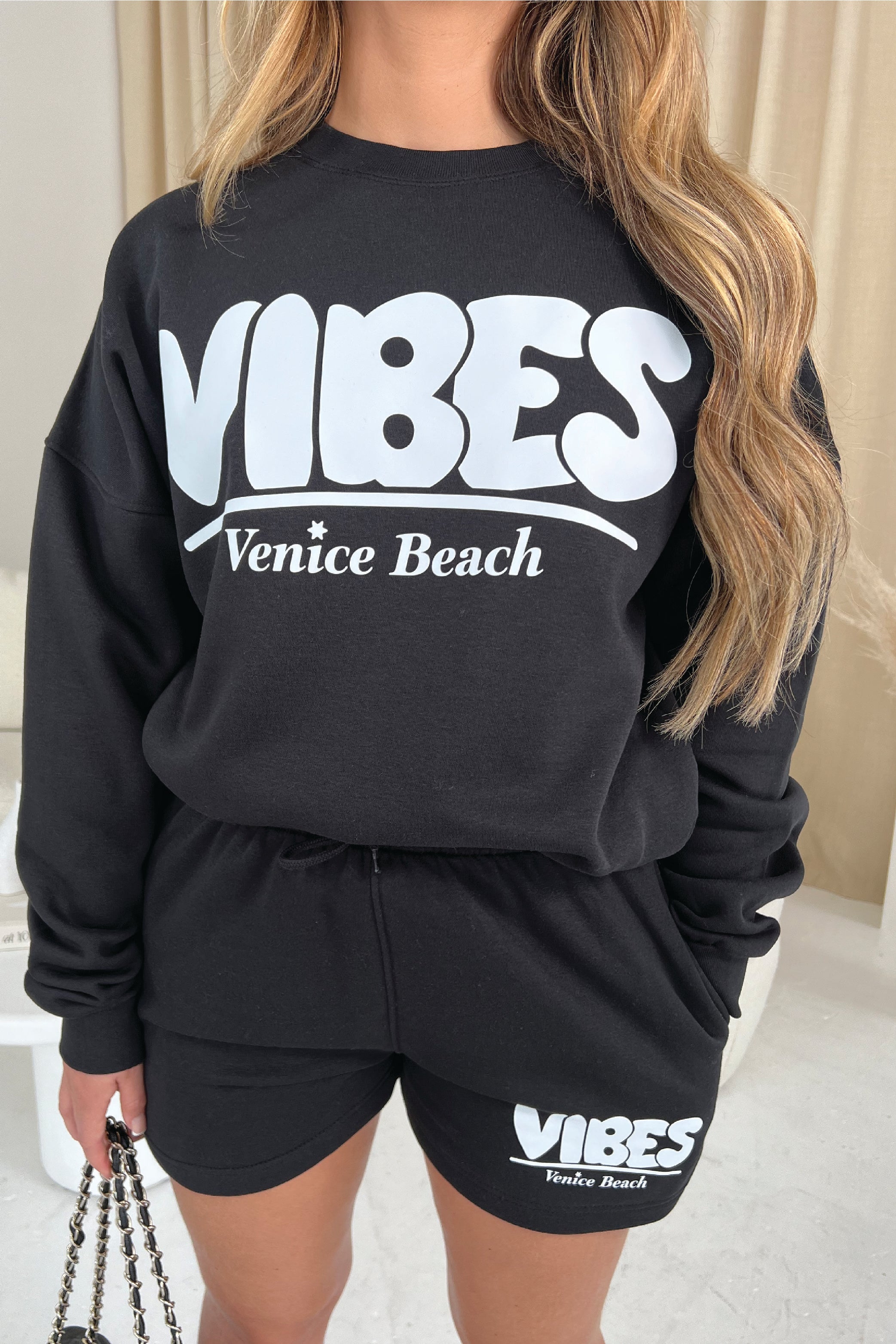 Featuring a soft-touch black material sweater with our in house Vibes Venice Beach print, matching elasticated drawstring shorts that are also printed, both the sweater and shorts are made from the same material, pair this with a pair of fresh chunky trainers for a complete look.