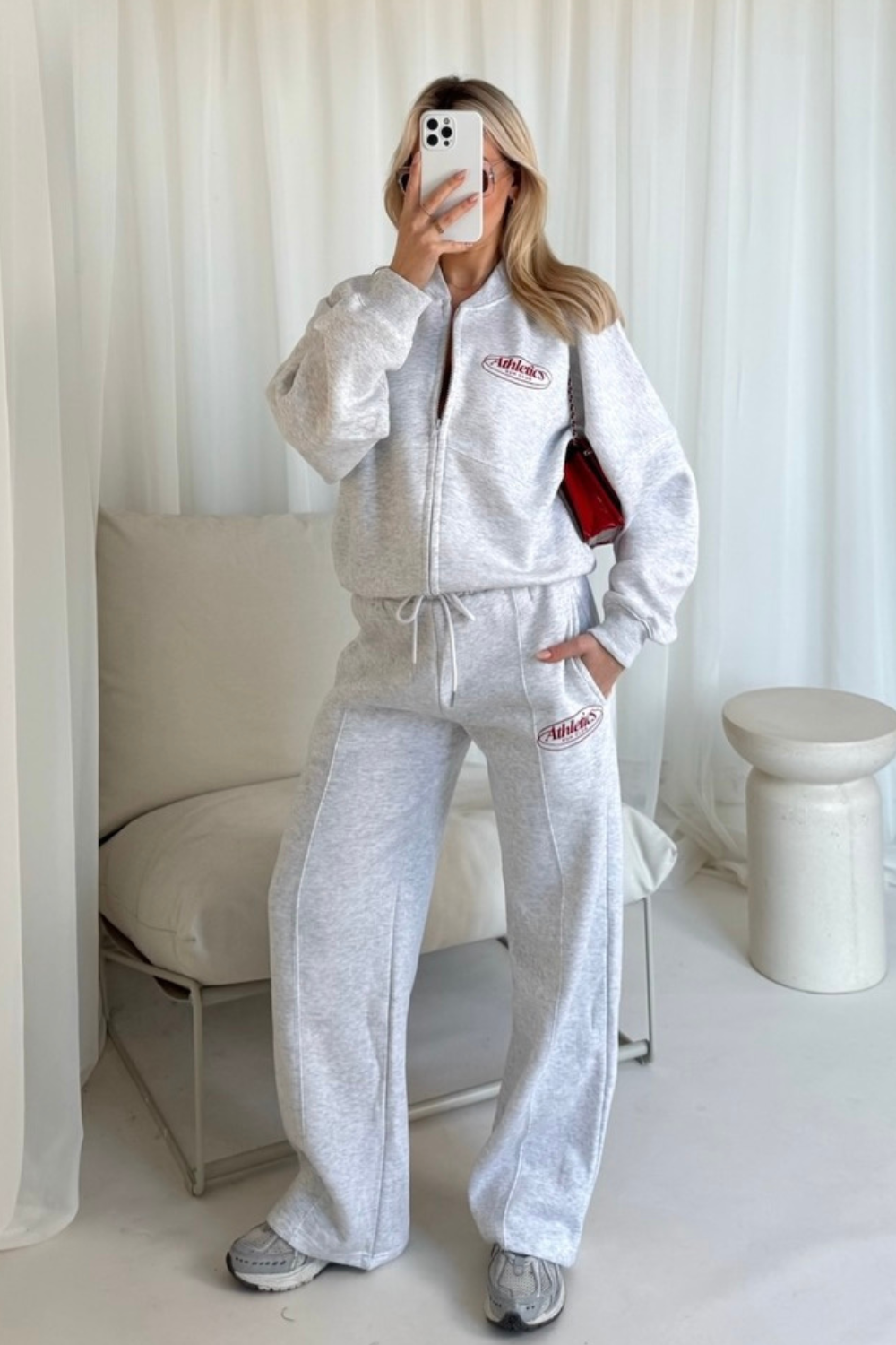 Stay stylish while lounging in this essential bomber jacket and straight leg jogger set. Featuring a gorgeous bomber jacket, constructed from light and soft fabric for a comfortable fit, and straight leg joggers with a drawstring waistband, this loungewear set is perfect for those looking for a chic, yet comfortable, look.