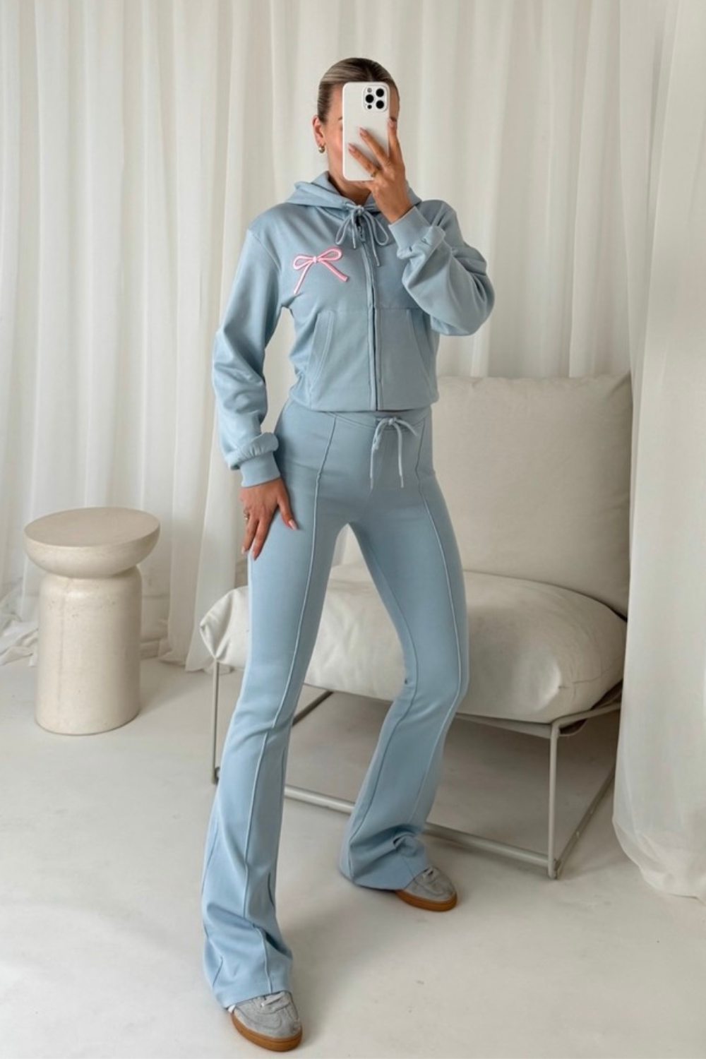 Bow embroidered blue cropped hoodie & flared leg jogger loungewear