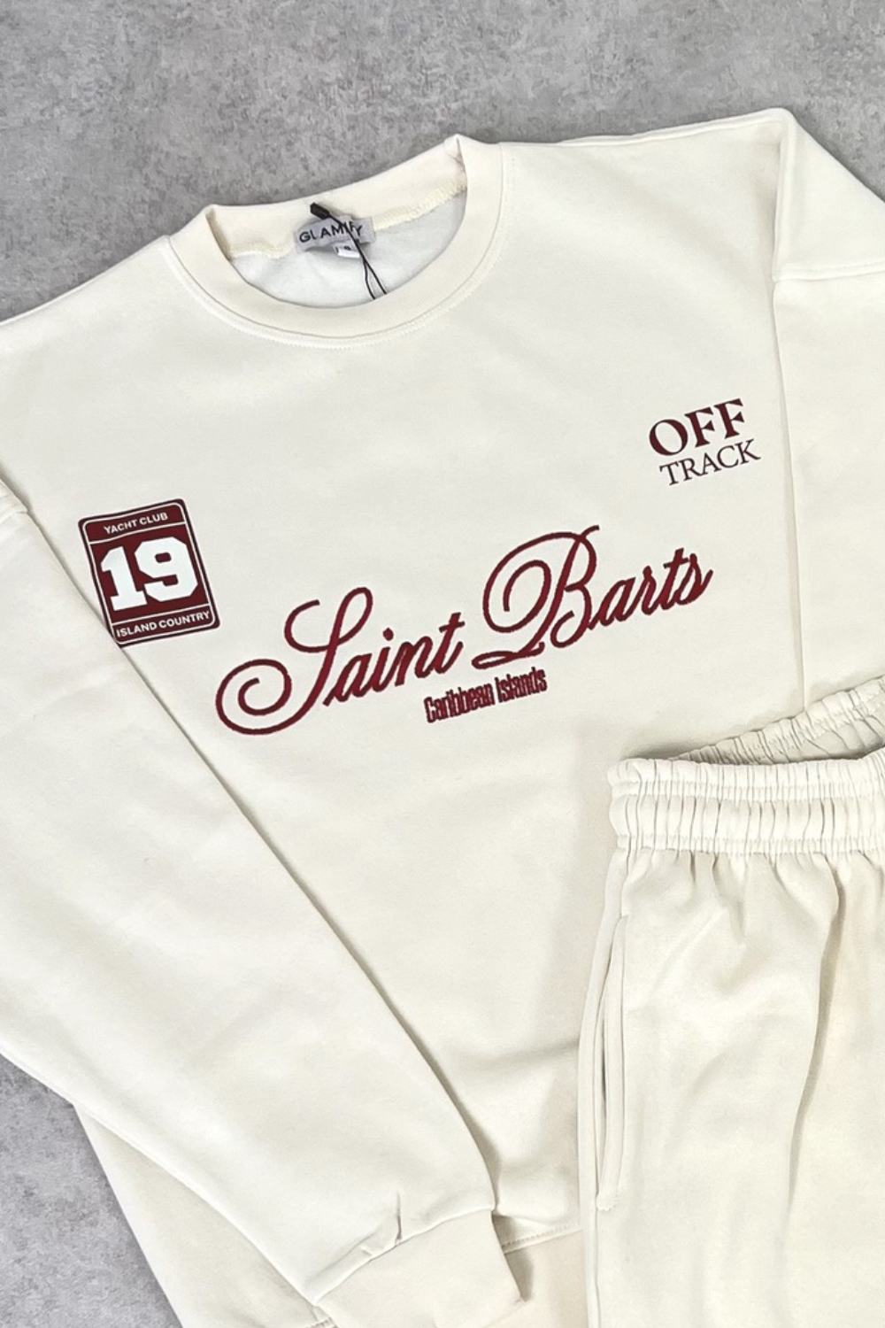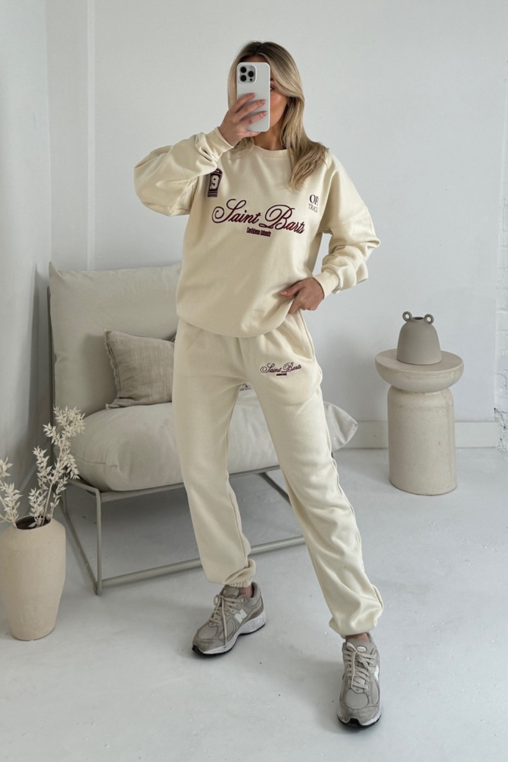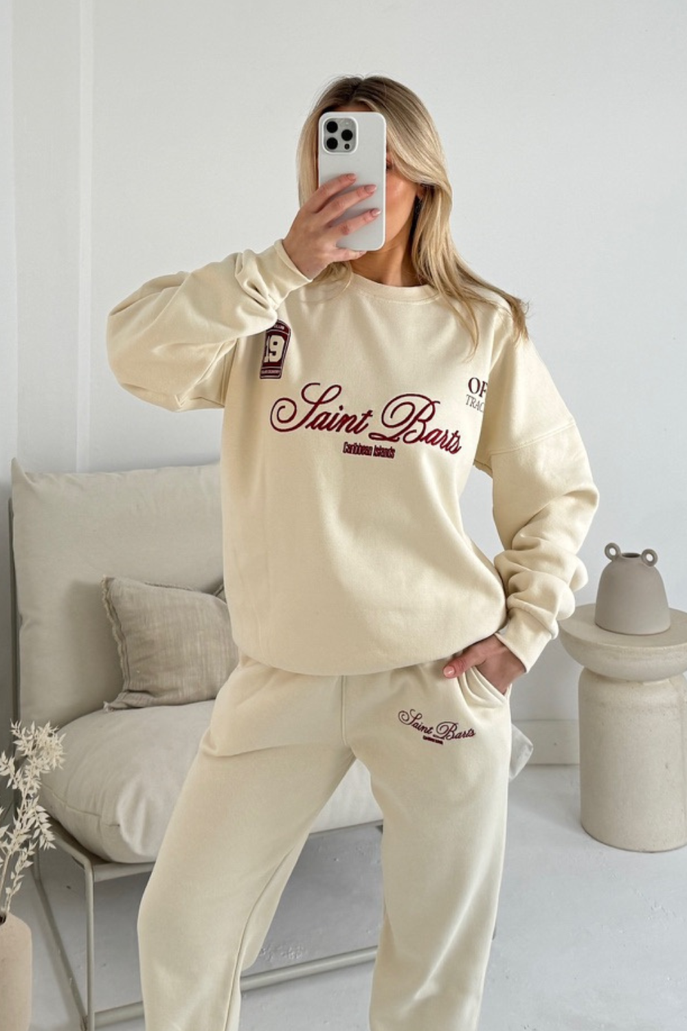 Introducing our new sweater set 'Saint Barts' , the set consists of a stunning sweater that has a round neck and dropped shoulders with our in house design applique on the chest. This also comes with a matching pair of drawstring joggers. Style with fresh trainers for a complete look.
