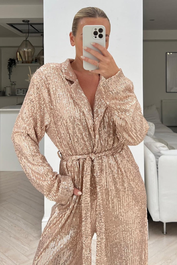 The jumpsuit is long sleeved with a plunge neck chest with all over rose gold sequins. Sparkle this party season in our pascal, jumpsuit this also comes with a cute tie waist belt, style with heels and clutch for a complete look.