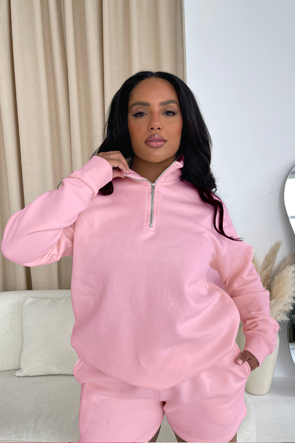 Our core 3/4 zip sweater has an oversized fit, dropped shoulders and a relaxed silhouette creating that perfect cozy loungewear look, pair with our matching shorts or joggers for a complete lounge look.