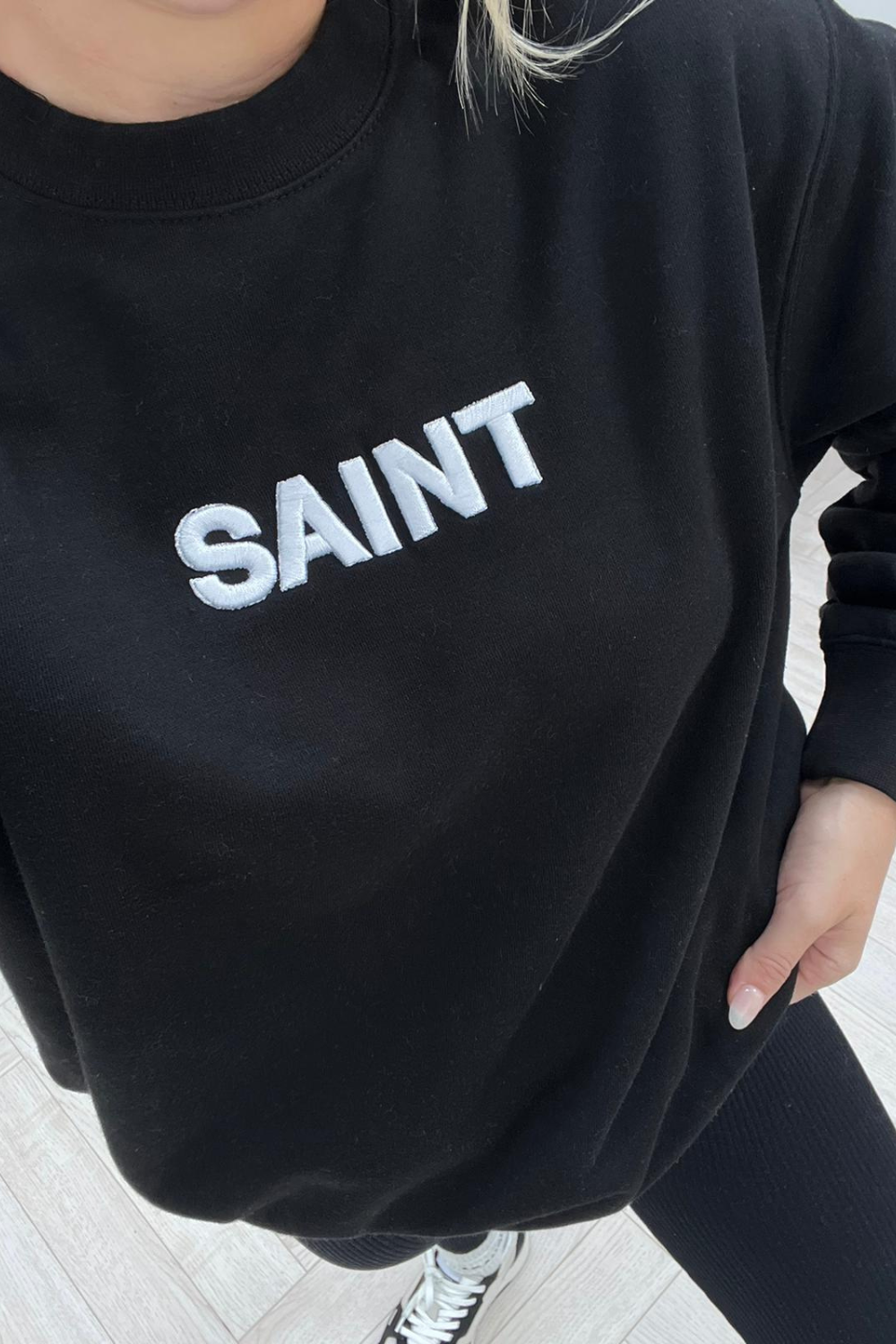 introducing our ' saint ' blue sweater, the sweater is round neck, long-sleeved and made from a stunning black material and is fleece lined, this looks amazing styled with leggings or cycling shorts with fresh trainers.