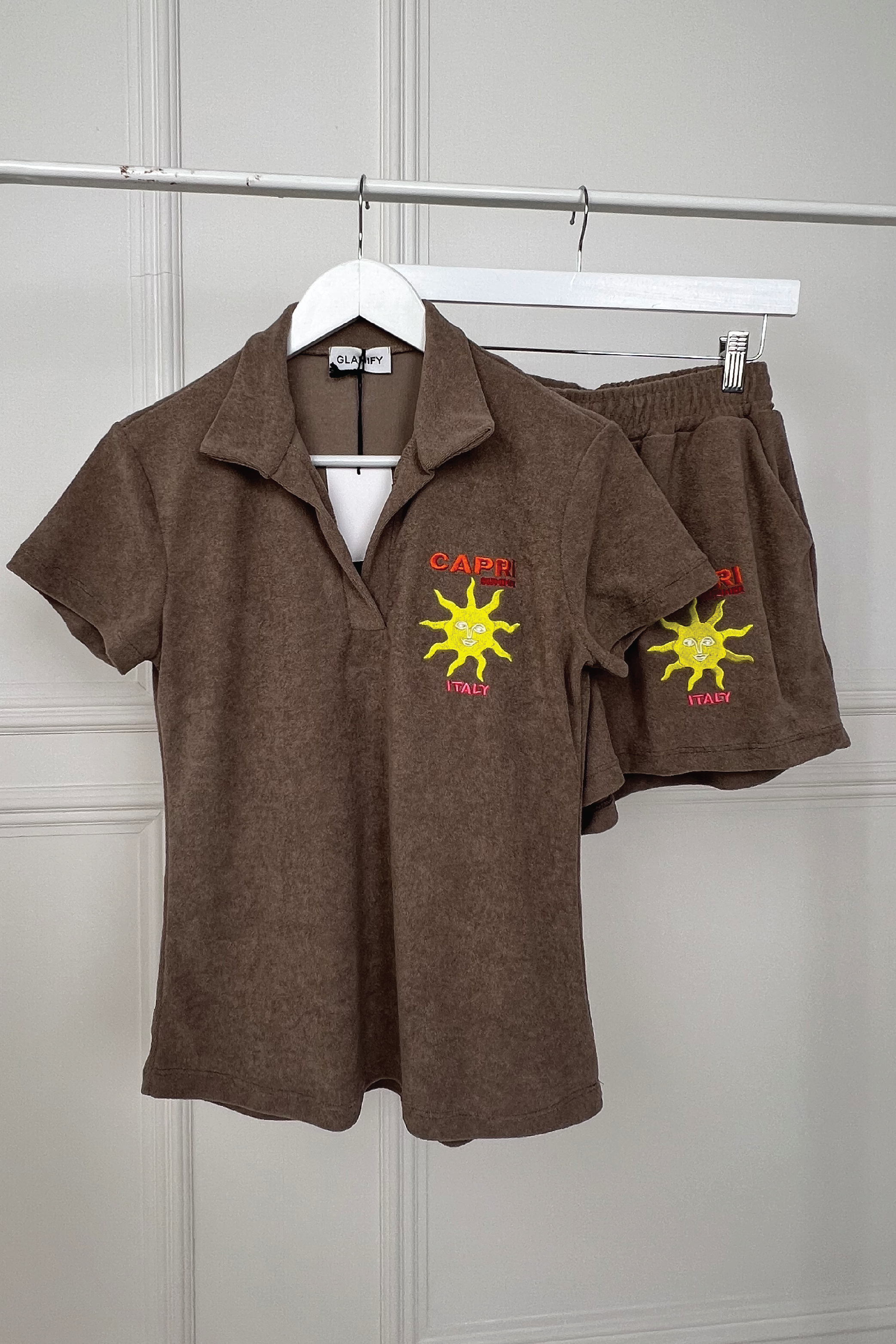 Get ready for some playful fun in these white embroidered towelling polo shorts co ord. Made for a holiday adventure, the elasticated waist and soft towelling fabric will keep you comfortable while the stylish polo design and embroidered details add a touch of quirkiness.