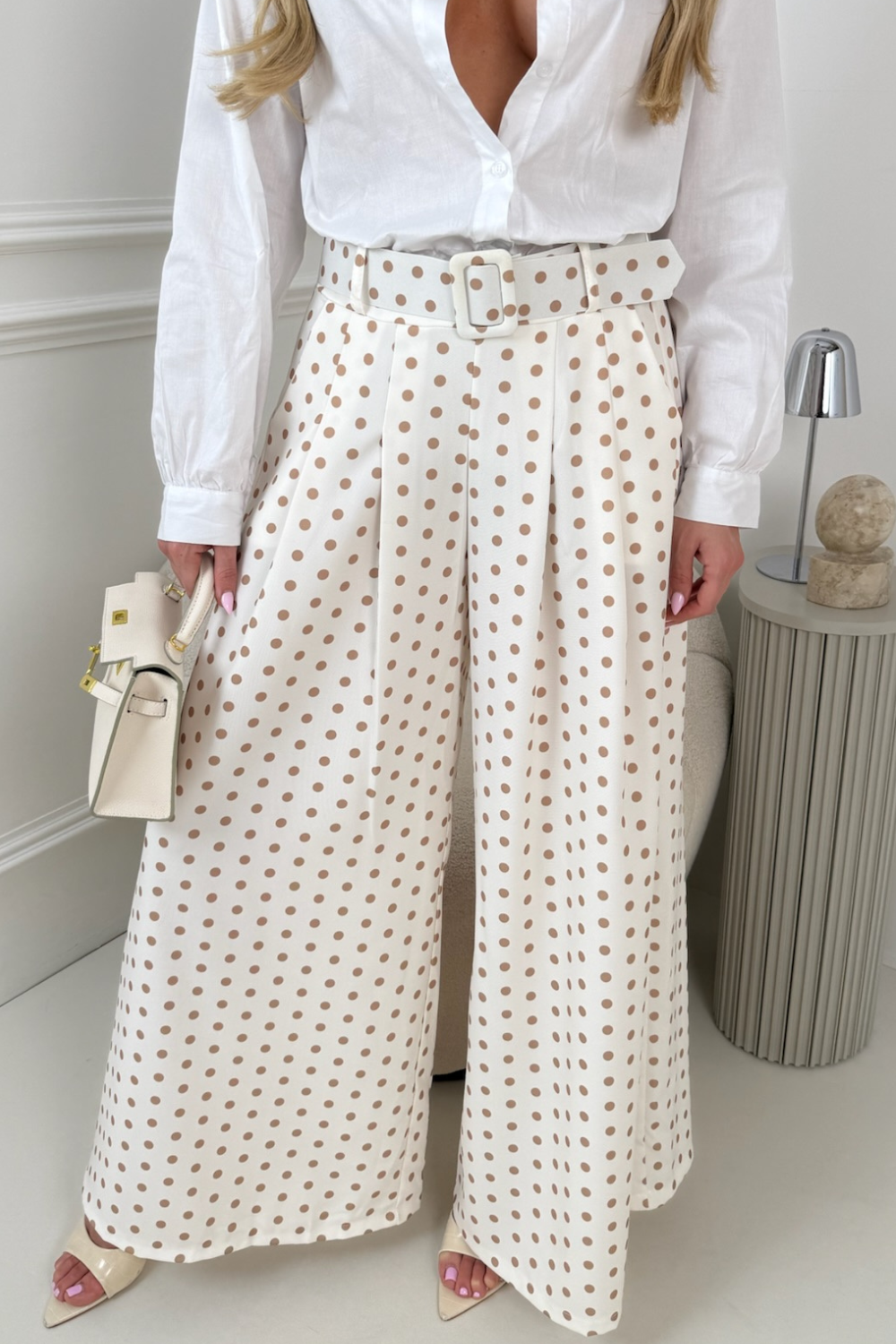 ADIBA CREAM POLKA DOT BELTED STRAIGHT LEG TROUSERS