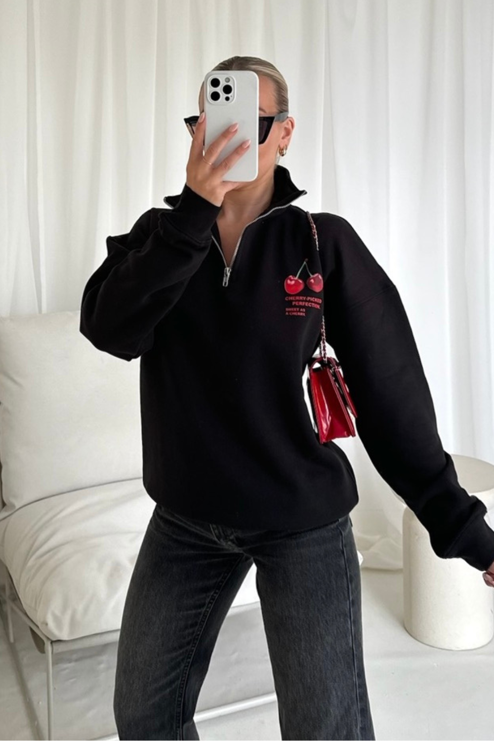 Featuring a soft-touch ecru material 3/4 zip up sweater with our the 'cherry perfection' printed design. This sweater is the perfect airport look just pair with some leggings or cycling shorts with sliders and your good to go.