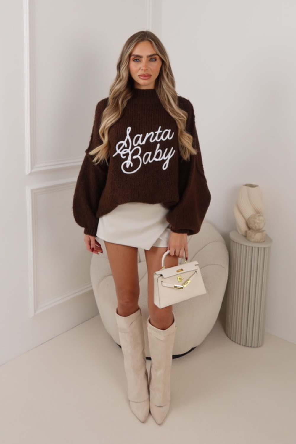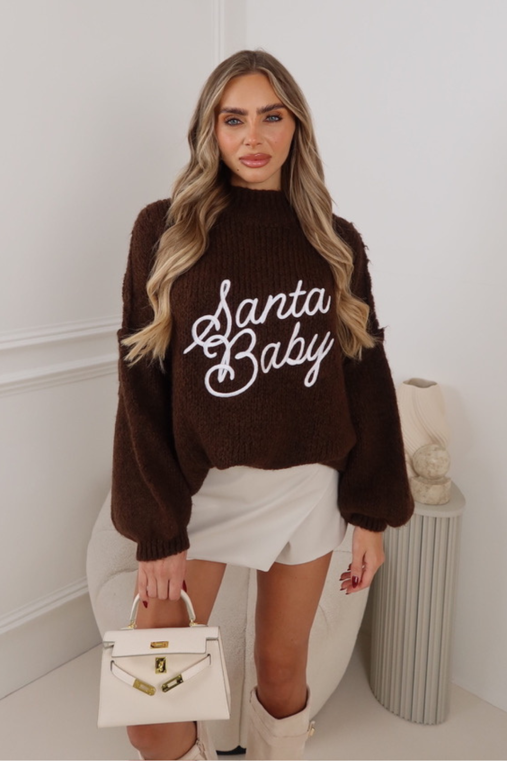 Get into the festive spirit with this oversized knit jumper! Embroidered with a playful "santa baby" design, this  jumper is sure to make a statement at any holiday party. Stay cozy and stylish all christmas long in this unique and quirky piece.