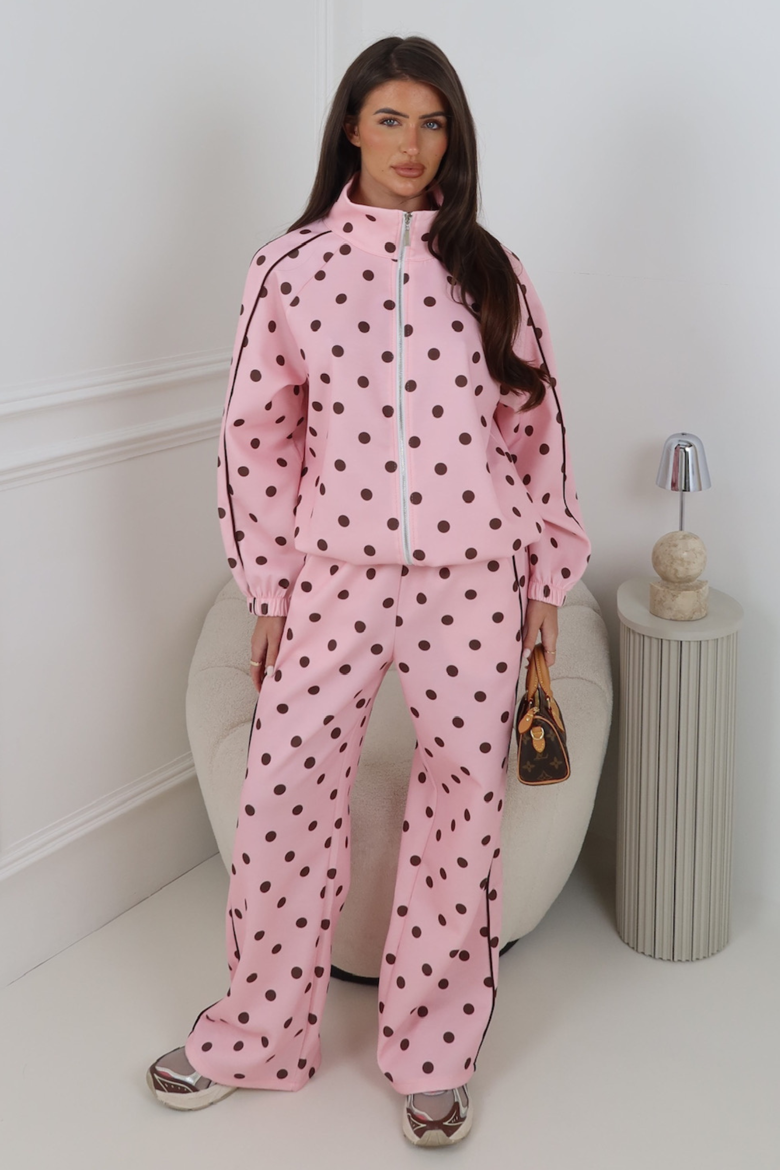 Off-duty but make it cute. The Kaia tracksuit features a zip-up jacket and matching high-waisted joggers in a playful polka dot print.