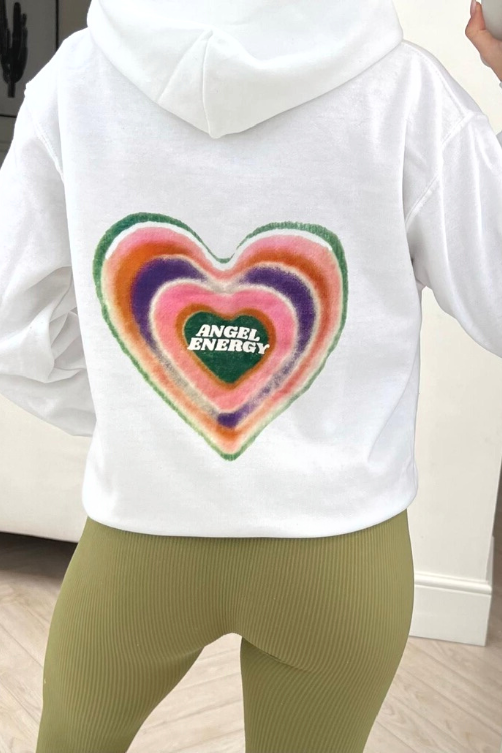 We all need a go to hoodie and our newest arrival is exactly that !, our ' angel energy ' hoodie is made from a soft white fleece line white material and has long sleeves and a drawstring hood. The hoodie features stunning print, Style this with leggings or cycling shorts and fresh trainers for a complete look.