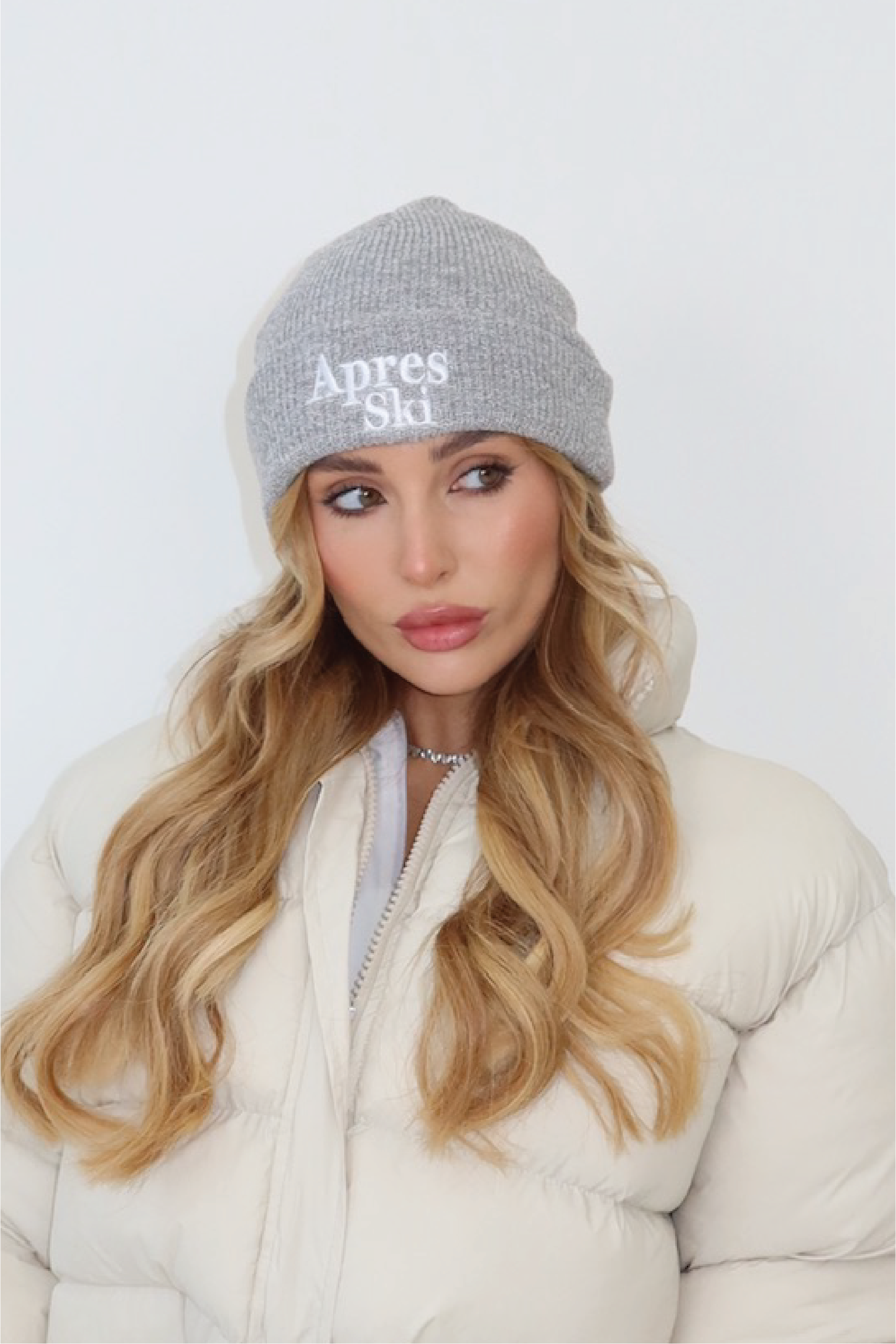 Apres ski grey embroidered knit beanie hat