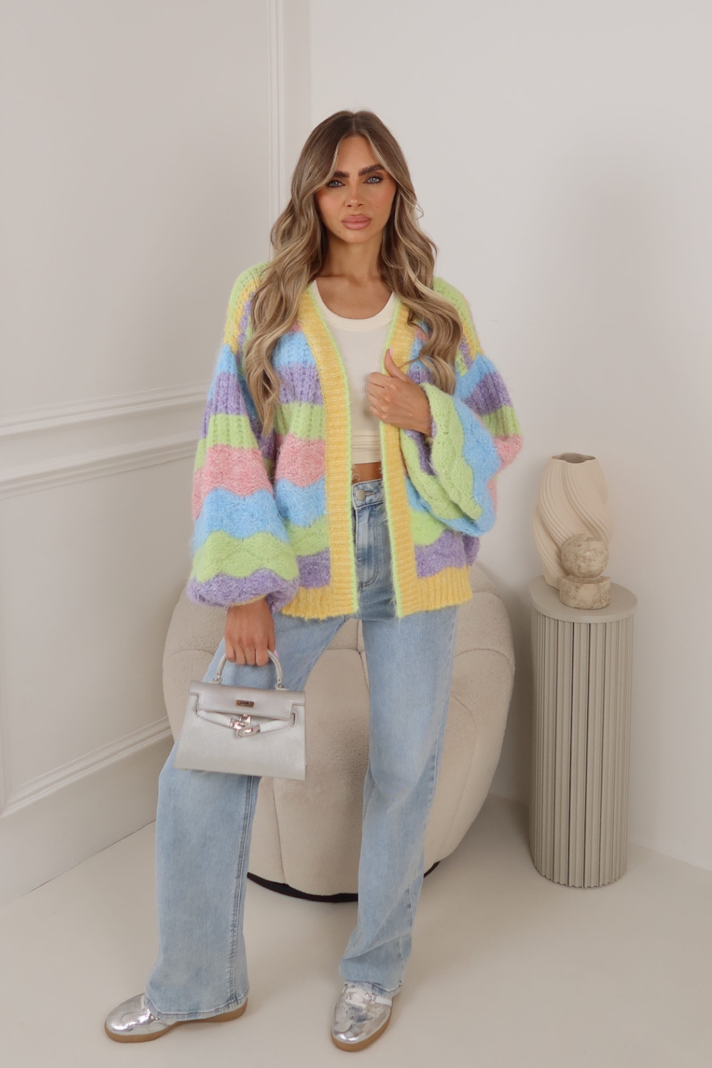 A cozy knitted cardigan featuring soft pastel stripes, designed for effortless style and comfort. Perfect for layering, it adds a light, dreamy touch to any outfit while keeping your look warm and chic.