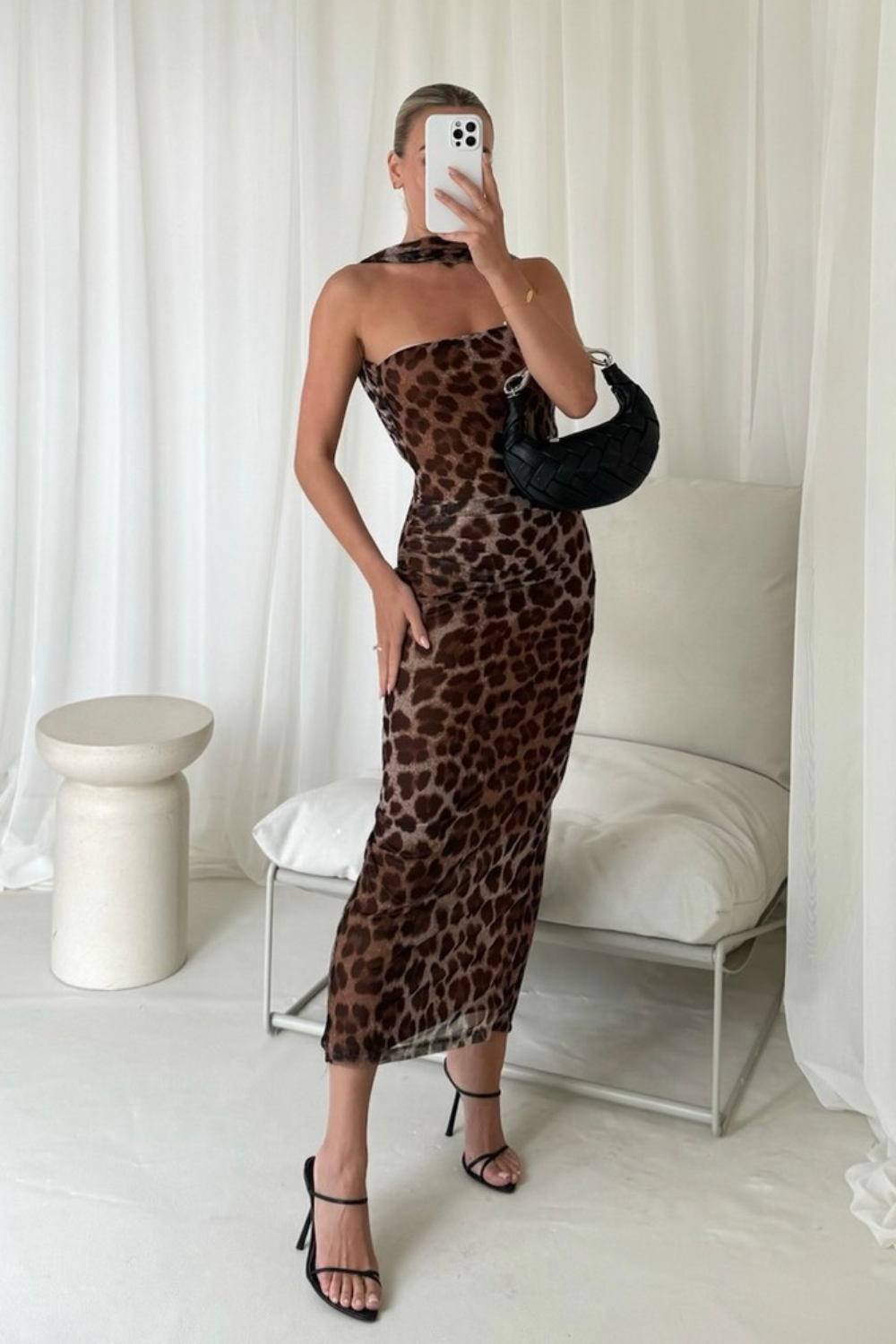 This dress is the perfect combination of elegance and edge. Featuring a unique leopard print pattern, wrap around choker style detailing, and mesh fabric, it's the ultimate dress for any dressy occasion. Elevate your style with this midi-length dress that hugs your curves in all the right places.