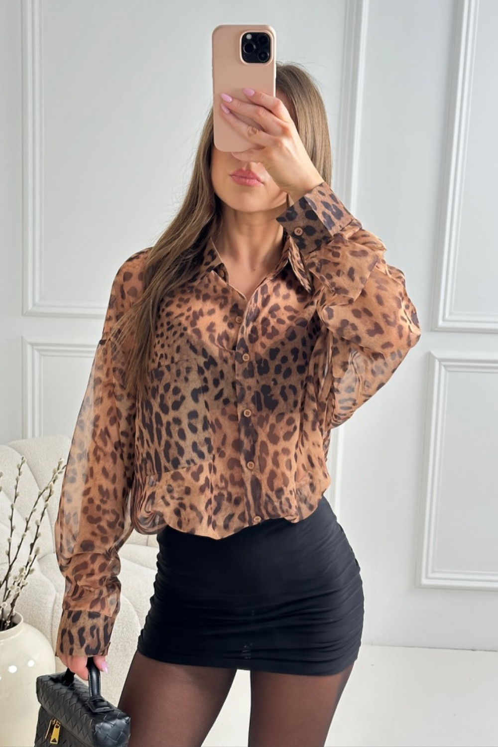 Unleash your wild side with the Frankie brown leopard sheer shirt. Perfect for dressing up or down, this playful piece adds a touch of sass to any outfit. Embrace your inner fashionista with its sheer fabric and fierce leopard print.