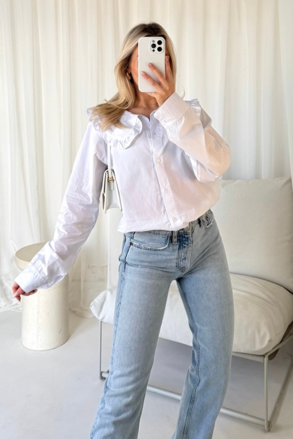 Unleash your wild side with the Lizzie white shirt! This stylish piece features an oversized trendy frill collar, perfect for dressing up or down. Stay classy and playful with this unique addition to your wardrobe.