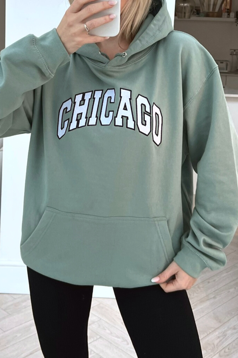 Introducing our newest release, which are our Glamify exclusive tee & legging coords. This features a soft sage hoodie embroidered with our stunning Chicago design in a white colour thread , this also comes with matching sage leggings, style with fresh trainers and a cute jacket.
