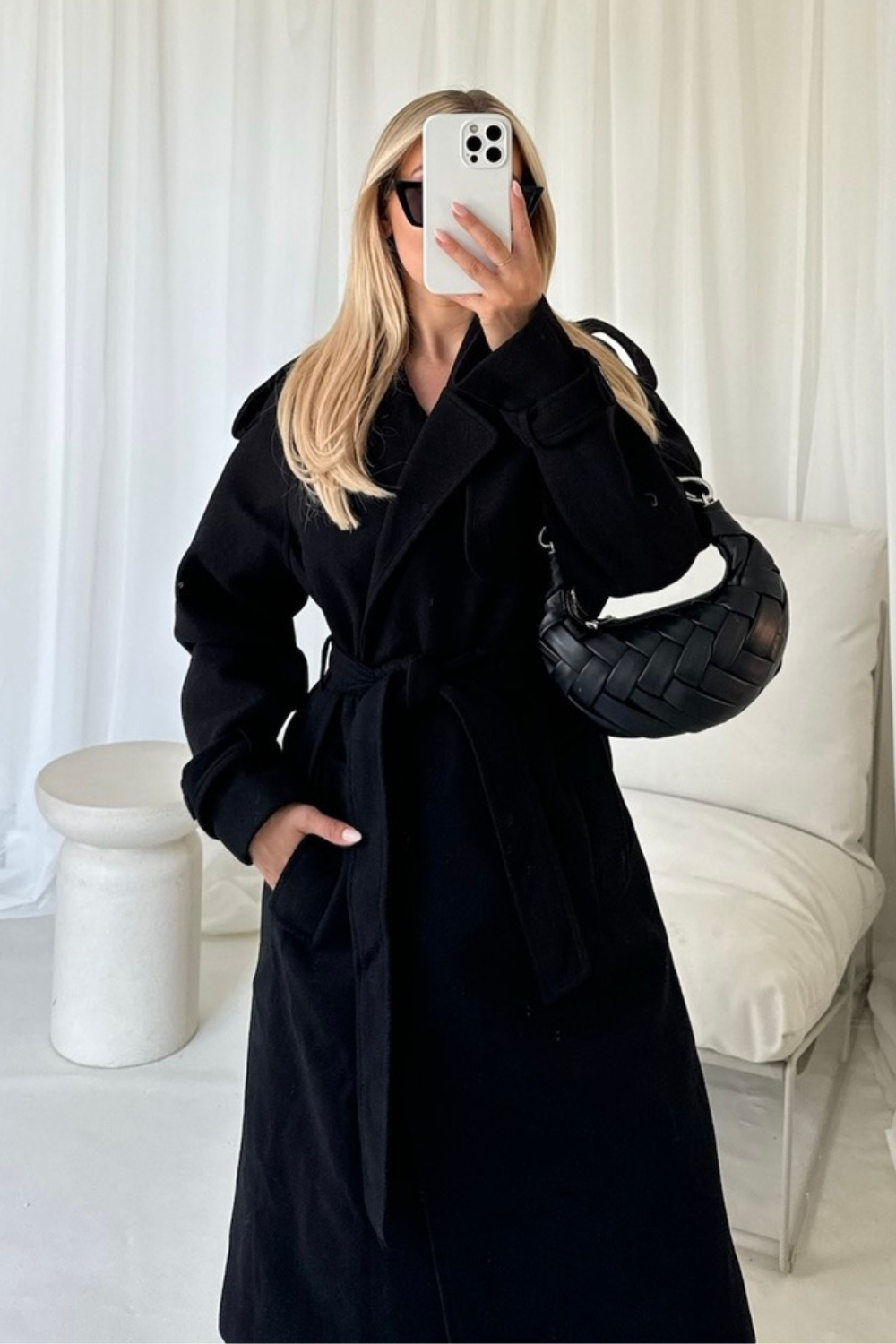 The Darla black long trench coat is the perfect combination of style and functionality. With its structured fit, this trench coat is ideal for the autumn and winter seasons. The addition of a belt and button detailing adds a touch of elegance. Shield yourself from the cold weather with this must-have coat.