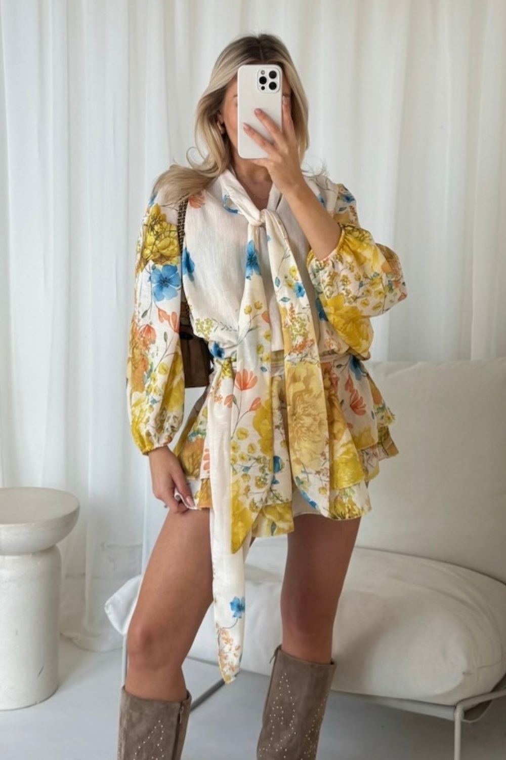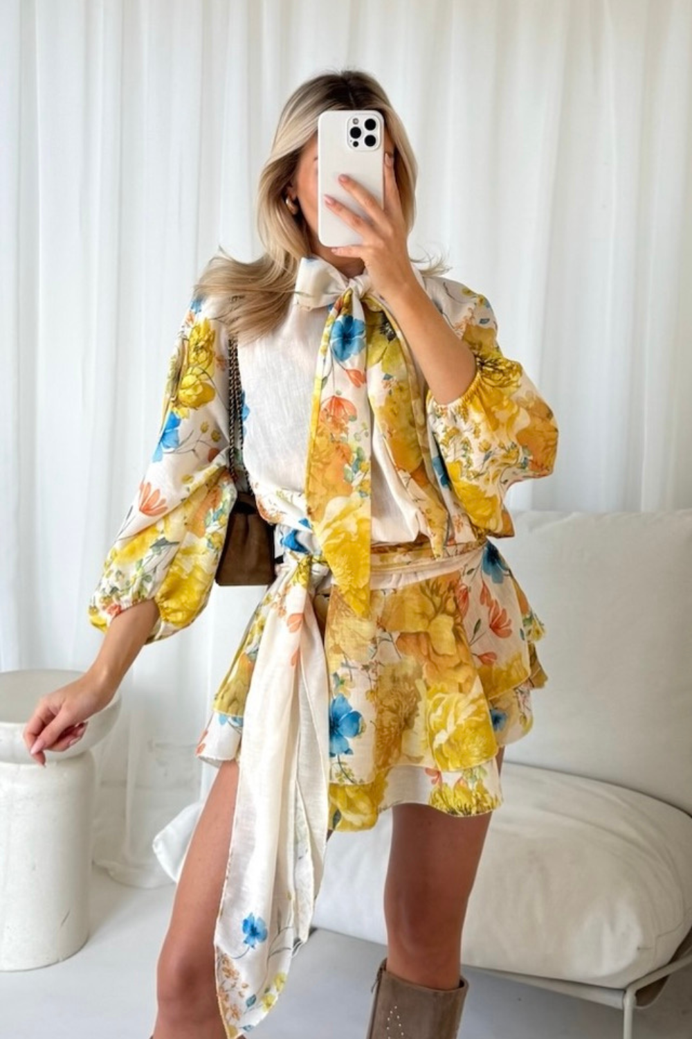 All dressed up with everywhere to go? Look no further than our Georgia yellow floral shirt dress. With its charming floral design and playful tie bow neck, this versatile piece can easily be dressed up or down for any occasion. Don't just take our word for it, try it out for yourself!