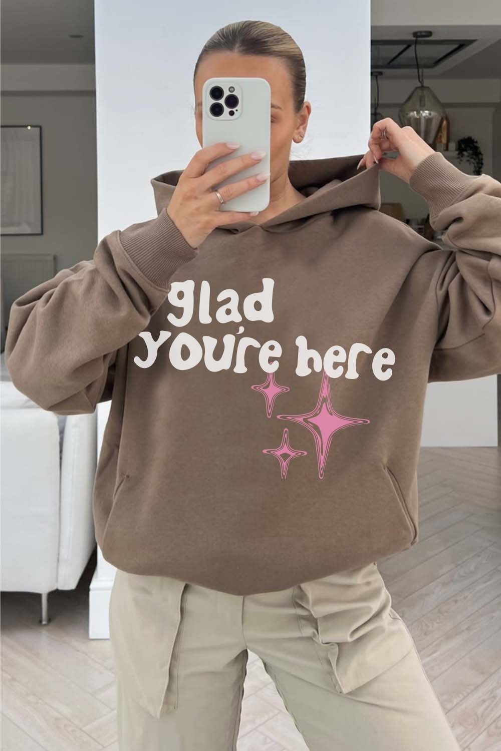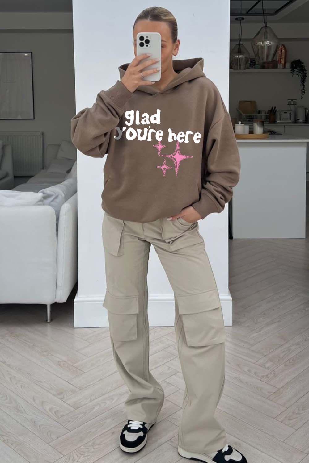 We all need a go to hoodie and our newest arrival is exactly that !, our ' Glad You're Here ' hoodie is made from a soft premium stone colour material which is fleece lined and has long sleeves and a hood. The hoodie features stunning print and hidden pockets, Style this with leggings or cycling shorts and fresh trainers for a complete look.