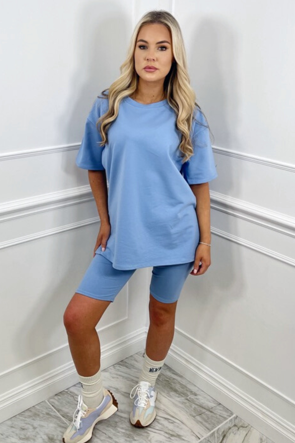 Introducing our newest arrival ' katie ' the set is made from a stunning blue stretch material, the top is has a a stunning relaxed/oversized fit with short sleeves and a round neck the matching cycling shorts have an elasticated waist and have a straight cut finish they are also stretchy.
