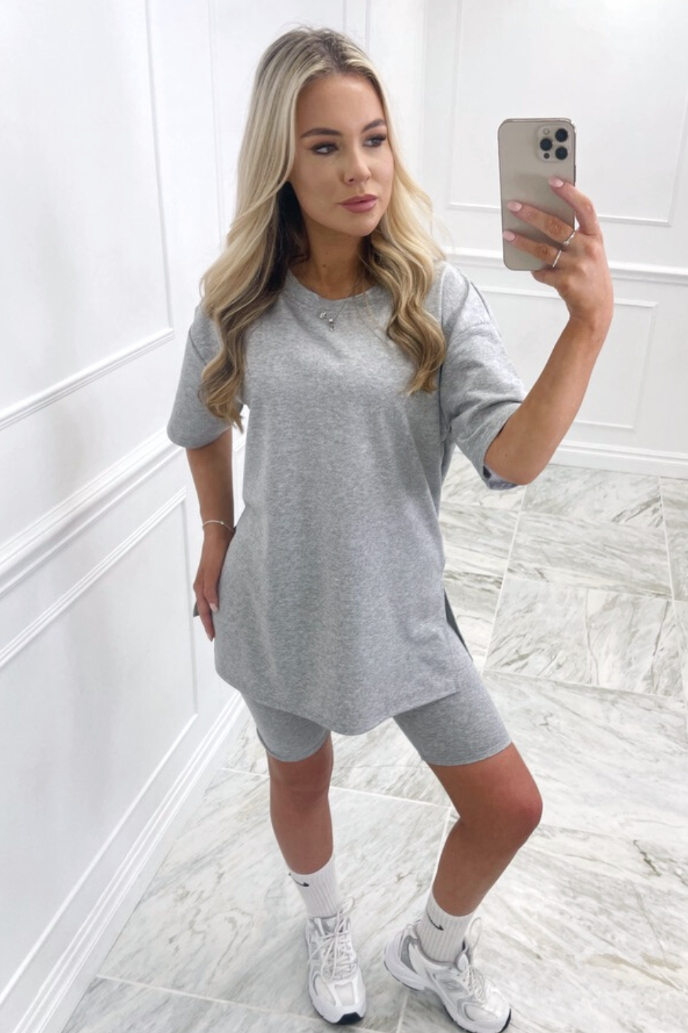 Introducing our newest arrival ' katie ' the set is made from a stunning grey stretch material, the top is has a a stunning relaxed/oversized fit with short sleeves and a round neck the matching cycling shorts have an elasticated waist and have a straight cut finish they are also stretchy.