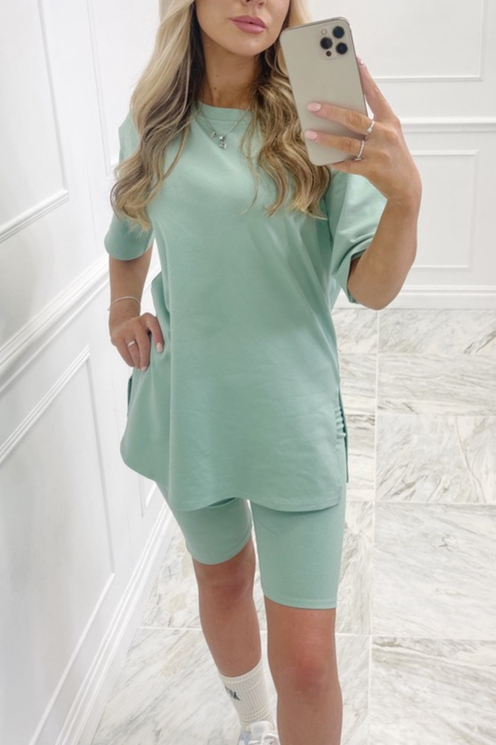 Introducing our newest arrival ' katie ' the set is made from a stunning mint stretch material, the top is has a a stunning relaxed/oversized fit with short sleeves and a round neck the matching cycling shorts have an elasticated waist and have a straight cut finish they are also stretchy.