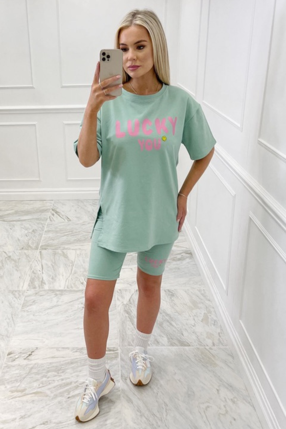 Introducing our newest arrival ' lucky you ' the set is made from a stunning mint stretch material, the top is has a a stunning relaxed/oversized fit and is printed with our stunning lucky you design with short sleeves and a round neck the matching cycling shorts have an elasticated waist and have a straight cut finish they are also stretchy.